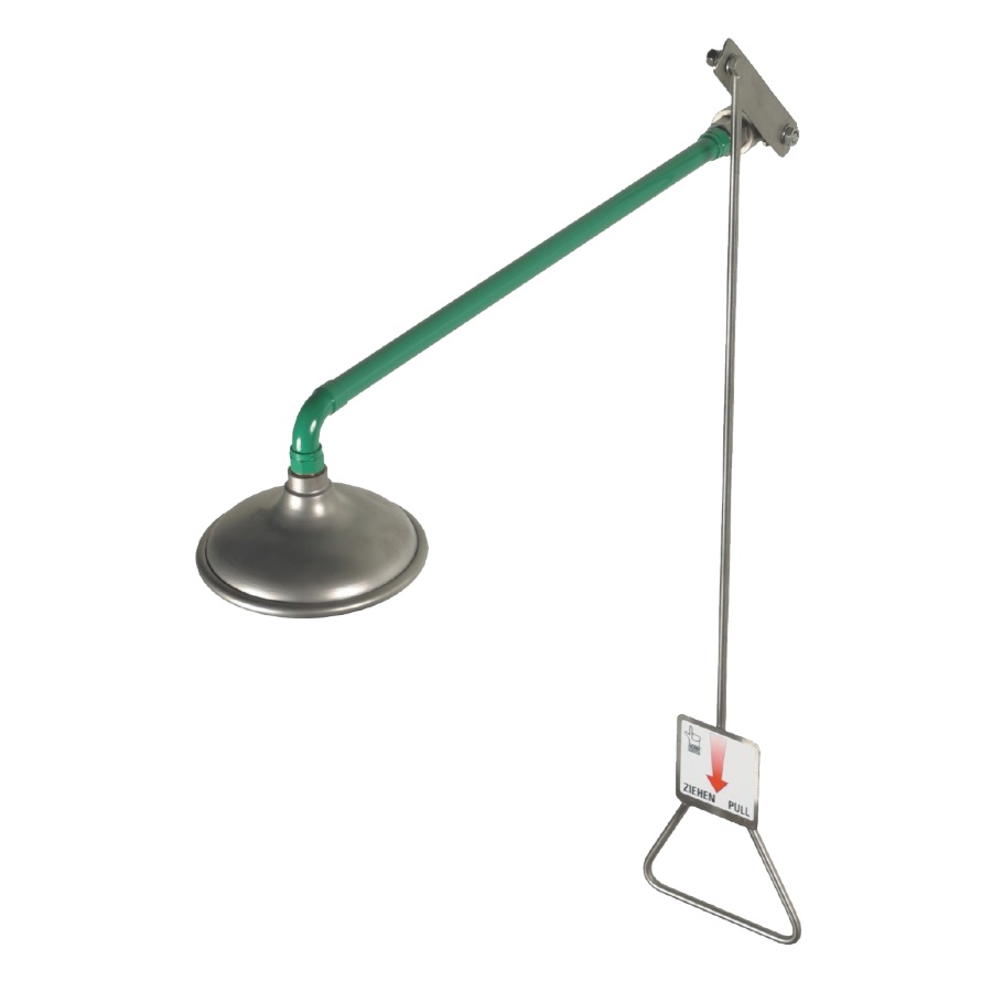 Prysznic zgodny z DIN EN 15154-1. Przeznaczony do montażu na ścianie (natynkowy). Głowica o Ø 15 cm wykonana ze stali szlachetnej. Szybka obsługa za pomocą specjalnego zaworu do pociągania ze stali szlachetnej, który nie zamyka się samoczynnie.