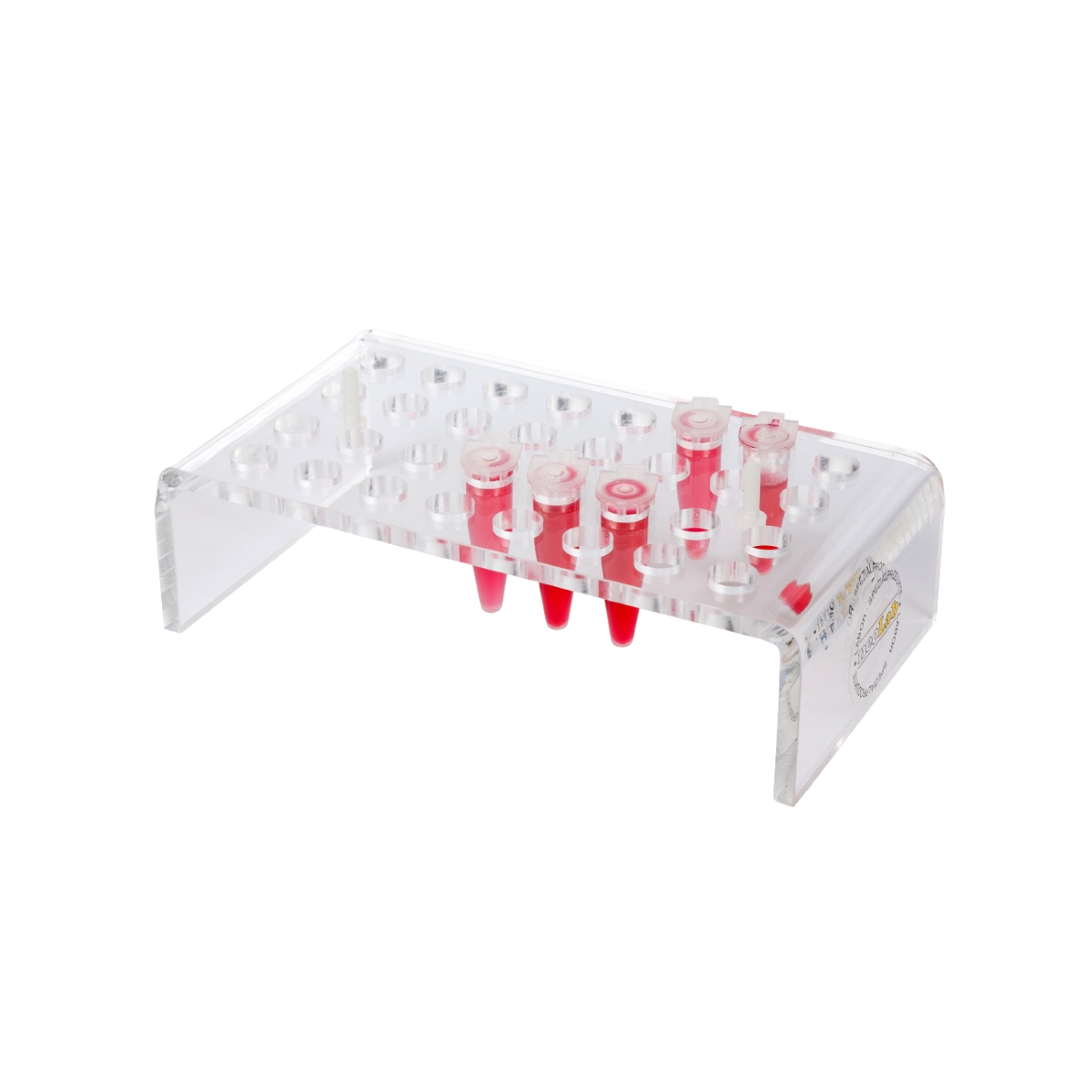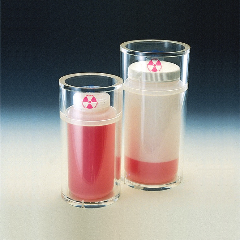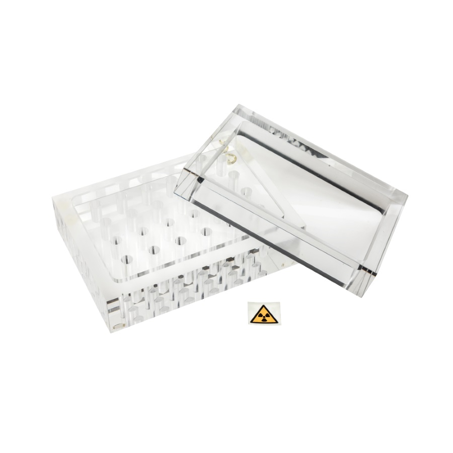 Masywny akrylowy pojemnik z otworami do przechowywania: 4 x 6 probówek o poj. 0,5 ml (model Nr Art. 4-2005) lub 1,5 i 2,0 ml (model Nr Art. 4-2006). Absorbuje promieniowanie Beta. Posiada zamykaną pokrywę ze znakiem ostrzegawczym.