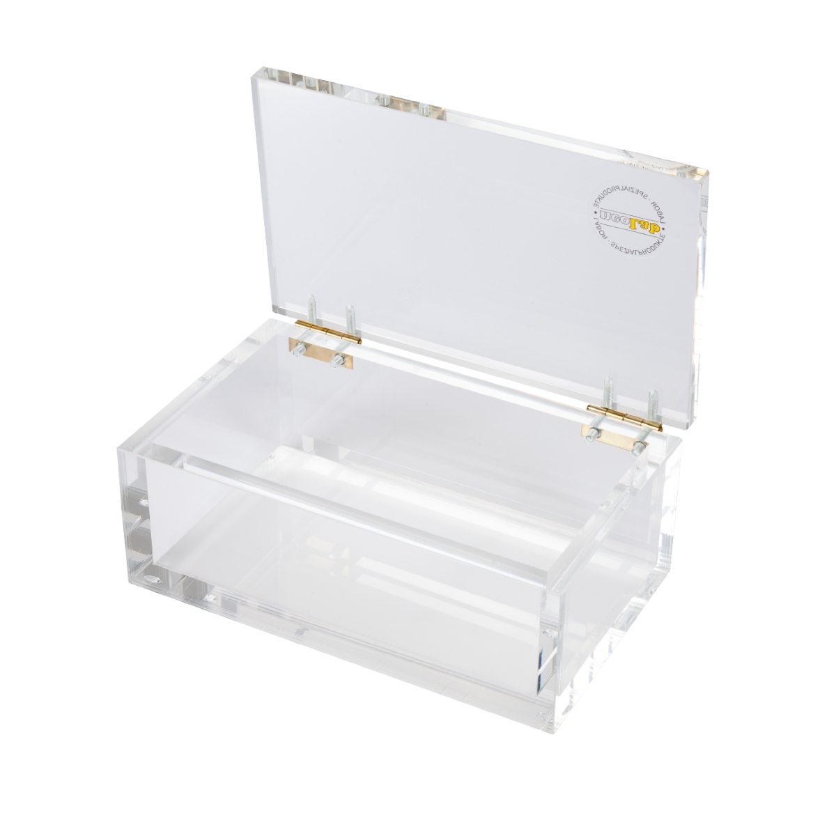 Pudełko z pokrywką chroniące przed promieniowaniem Beta. Wykonane ze szkła akrylowego o grubości 10 mm.