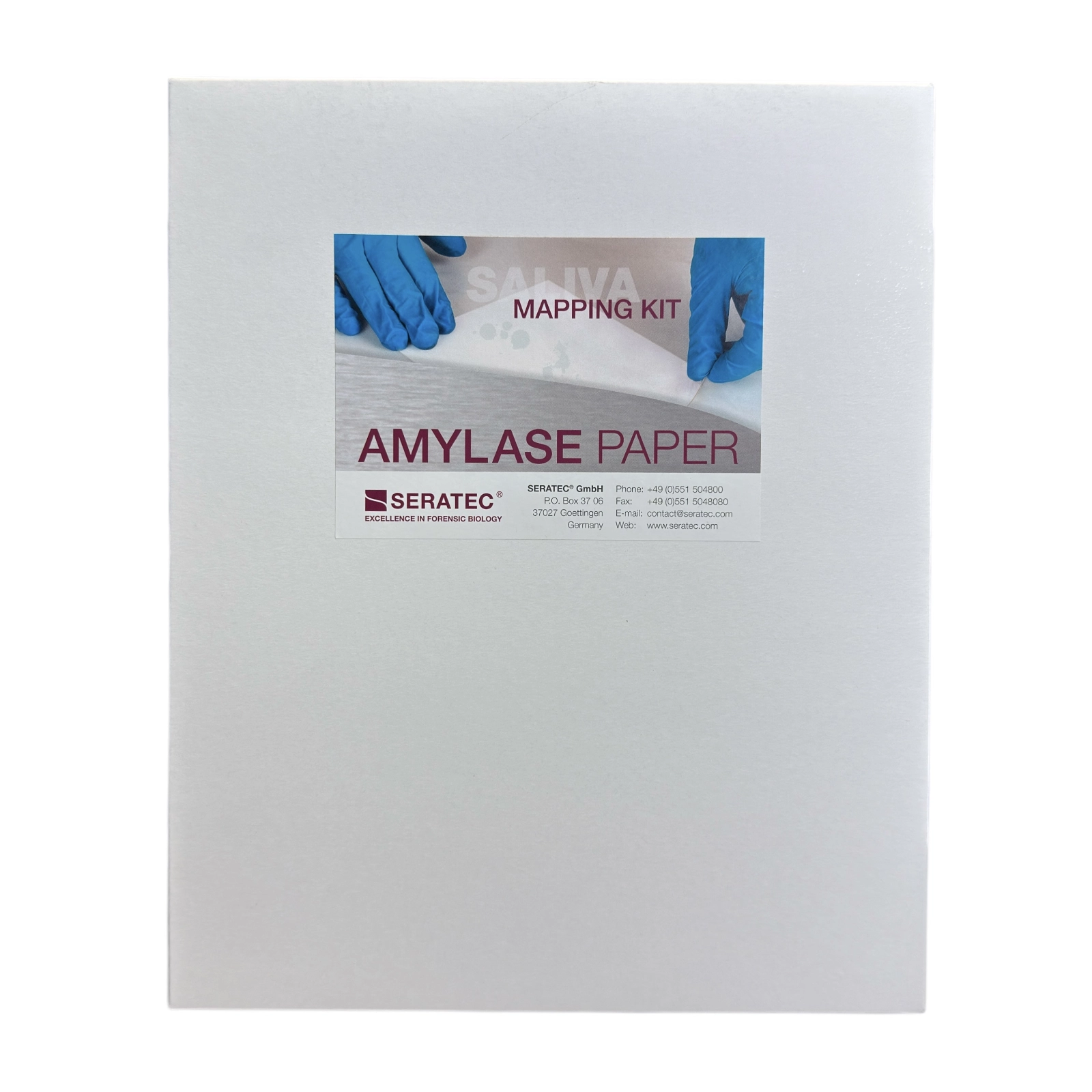 Seratec® AmylasePaper służy do szybkiego obrazowania amylazy w celu identyfikacji śladów śliny na kryminalistycznym materiale dowodowym. Produkt umożliwia mapowanie rozmieszczenia śliny, co jest przydatne w kryminalistyce. Próg wykrywalności amylazy wynosi 100 mIU/ml. Opakowanie zawiera 25 arkuszy AmylasePaper, 50 ml roztworu jodu w jodku potasu oraz instrukcję obsługi.