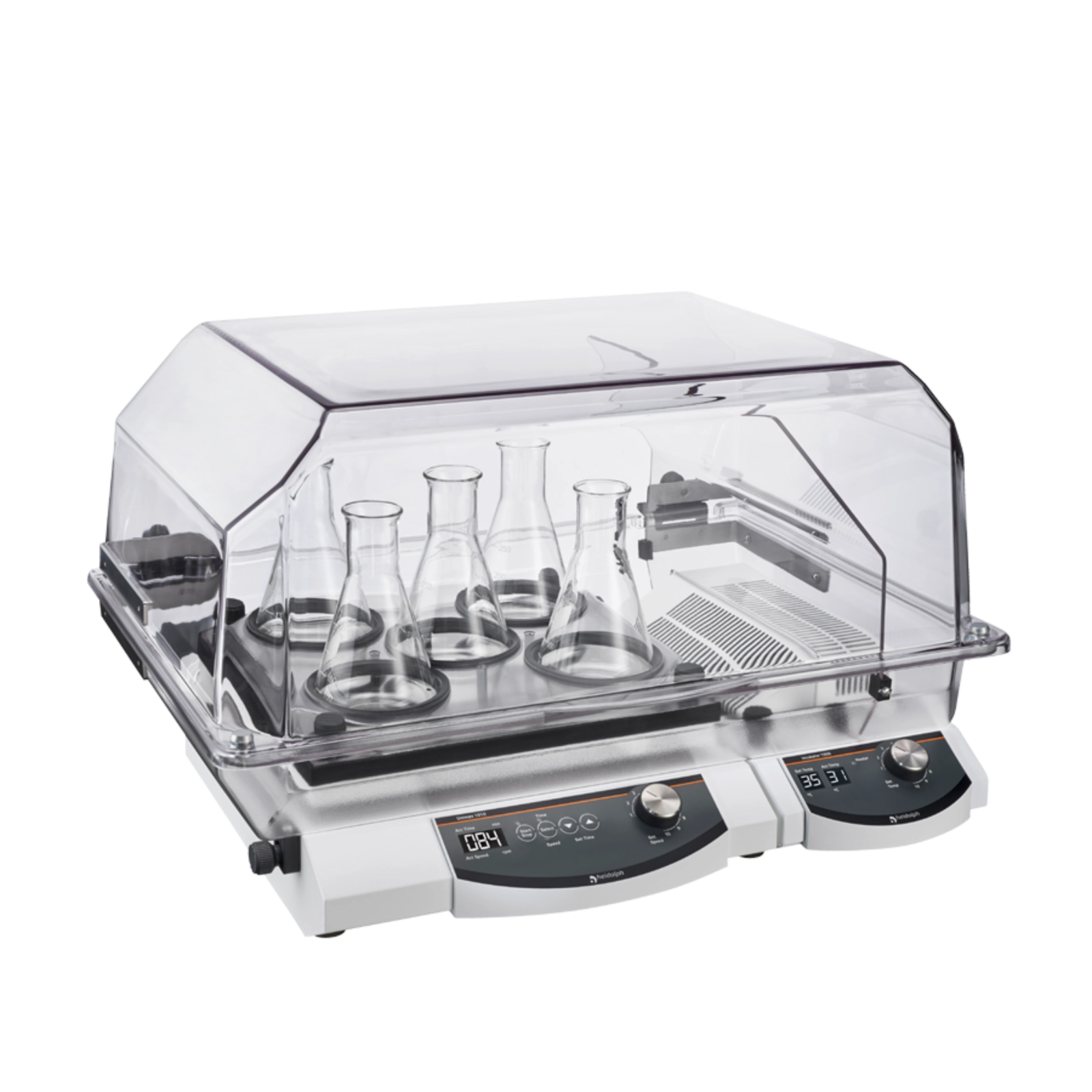 - inkubatory z wytrząsaniem –niezwykle wydajne urządzenia pozwalające na wytrząsanie i mieszanie płynów hodowlanych, a także m.in. hodowlę bakterii, drożdży, mikroorganizmów, są dostępne z wymiennymi płytami roboczymi o różnym przeznaczeniu (np. z adapterami na małe probówki lub na płytki mikrotitracyjne), funkcja wytrząsania może zostać wyłączona, wtedy urządzenie pracuje jak statyczny inkubator.