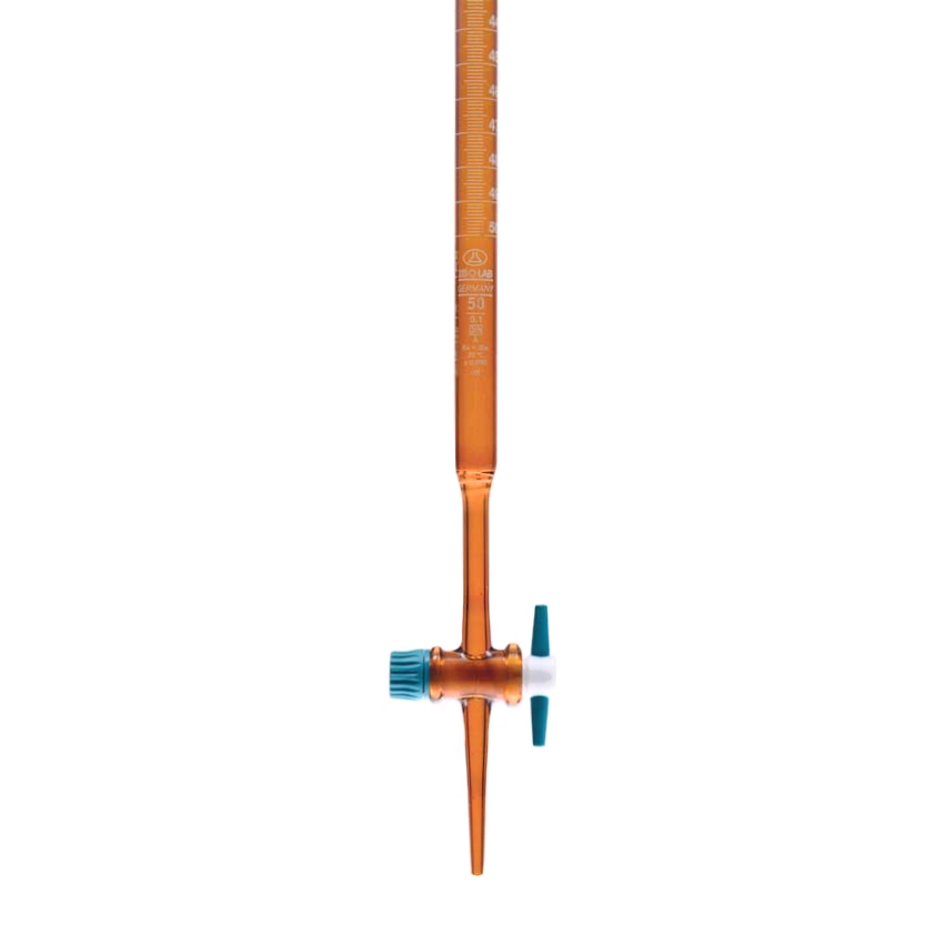 Biurety proste wykonane z oranżowego szkła borokrzemowego 3.3. Z kurkiem odcinającym z PTFE. Klasa „AS”. Przeznaczone do miareczkowania roztworami wrażliwymi na działanie światła.