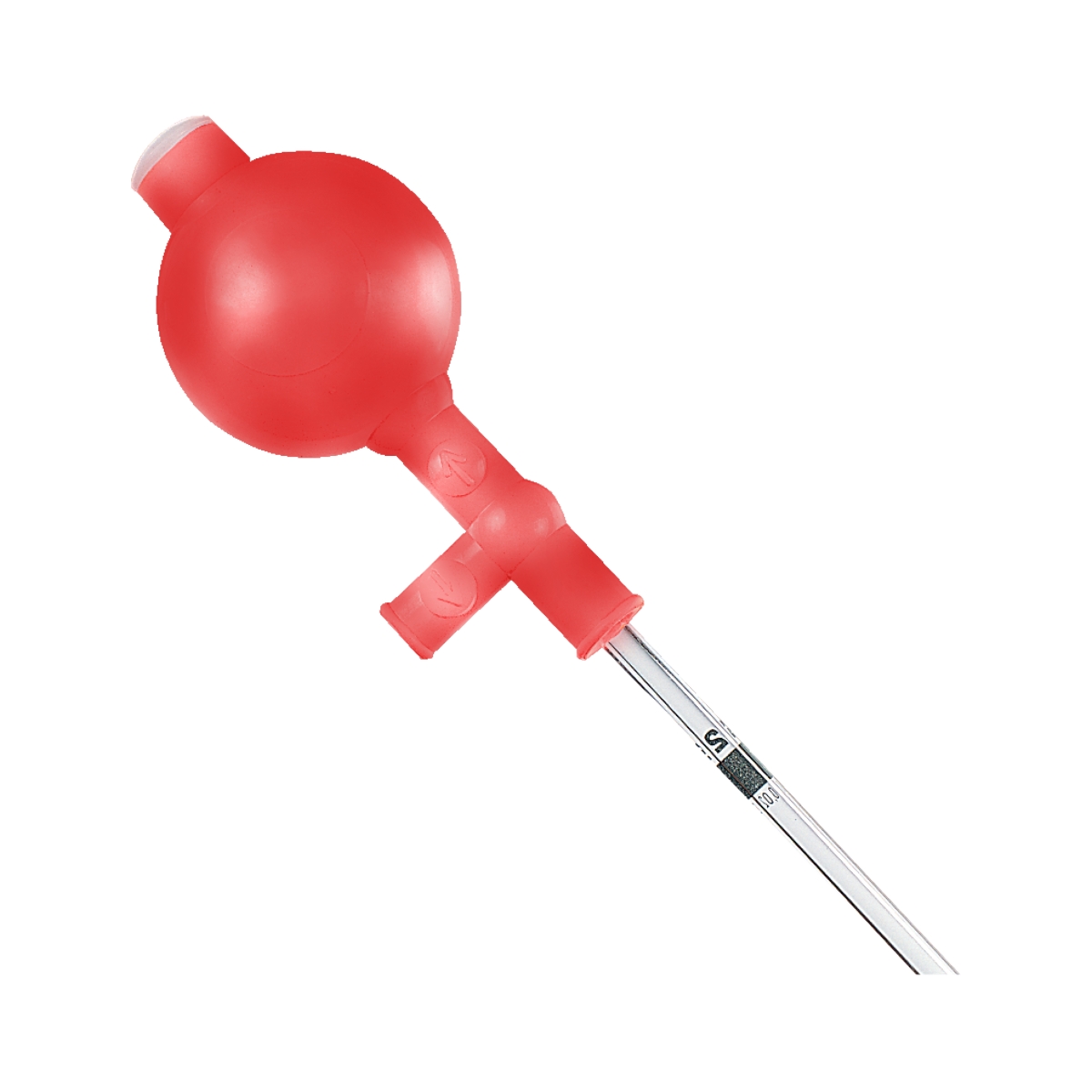 Gruszka do pipet z czerwonej gumy. Łatwa w obsłudze. Silnie ssąca. Z trzema zaworami: zawór A – wypuszczanie powietrza, zawór S – zasysanie cieczy, zawór E – spuszczanie cieczy.