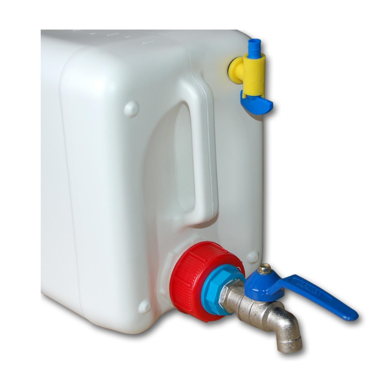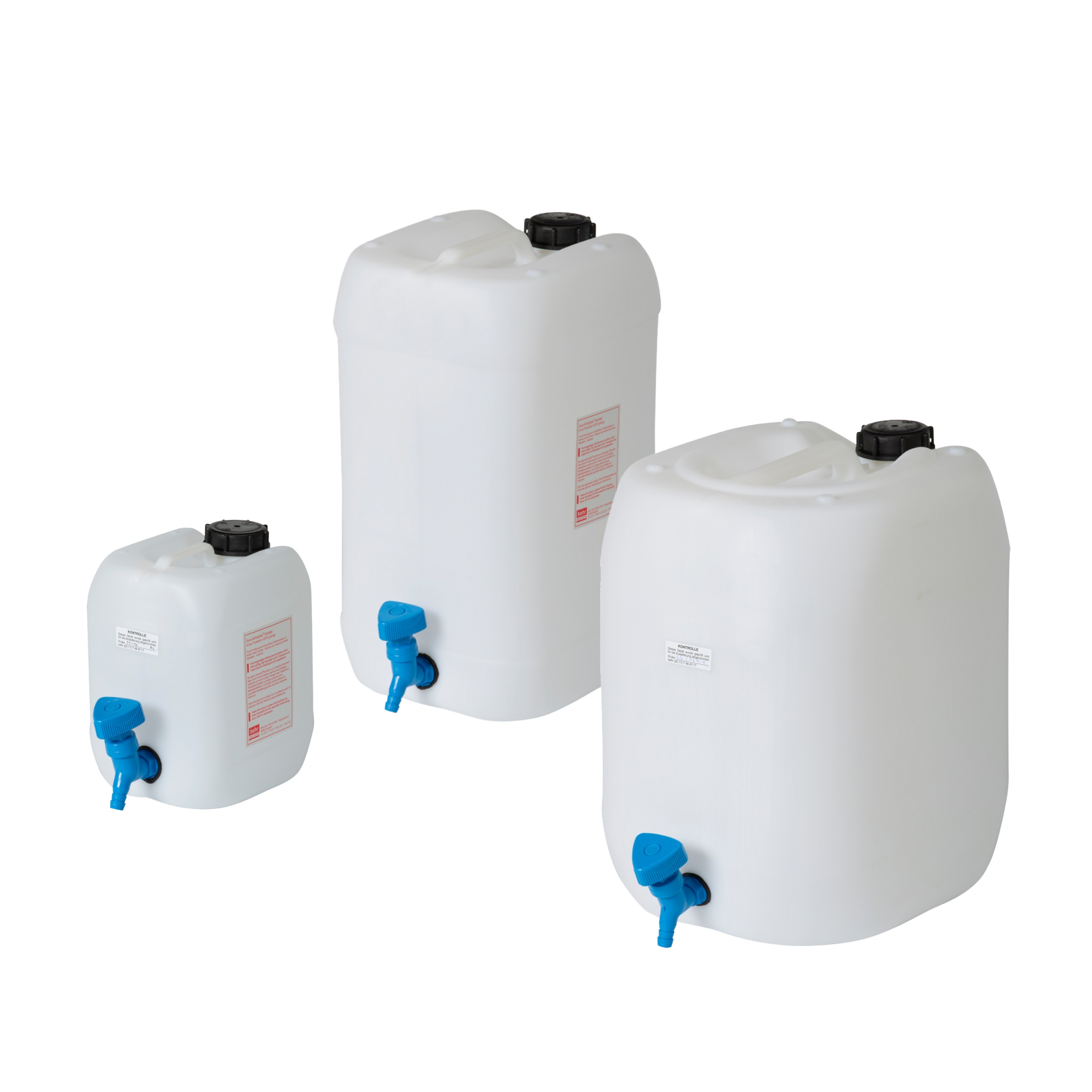 Kanistry z HDPE z zakrętką i ze zintegrowanym kranem. Wyposażone w rączkę. Wlew umieszczony u góry. Sprawdzone pod względem szczelności. Kolor biały – mleczny.