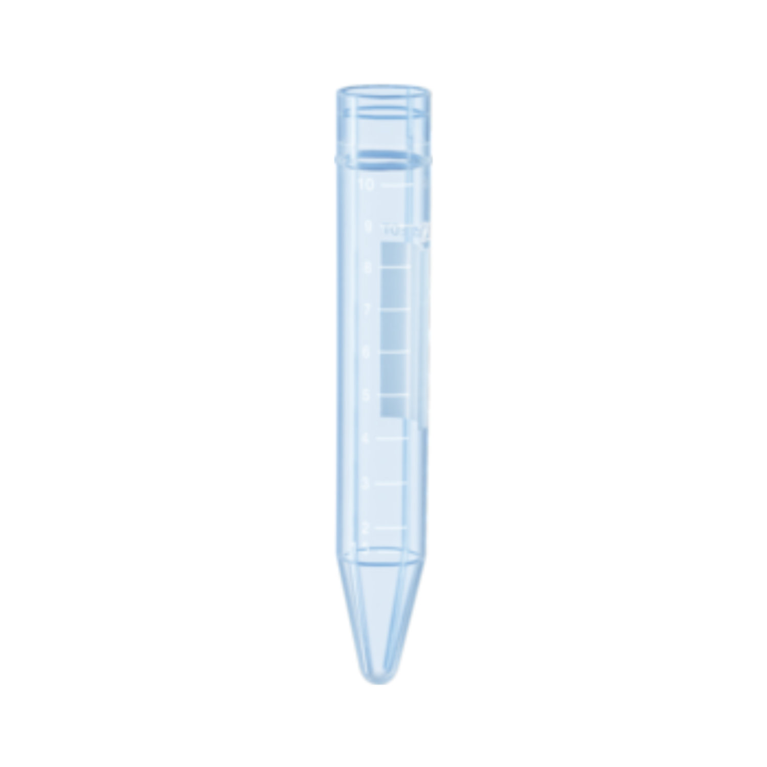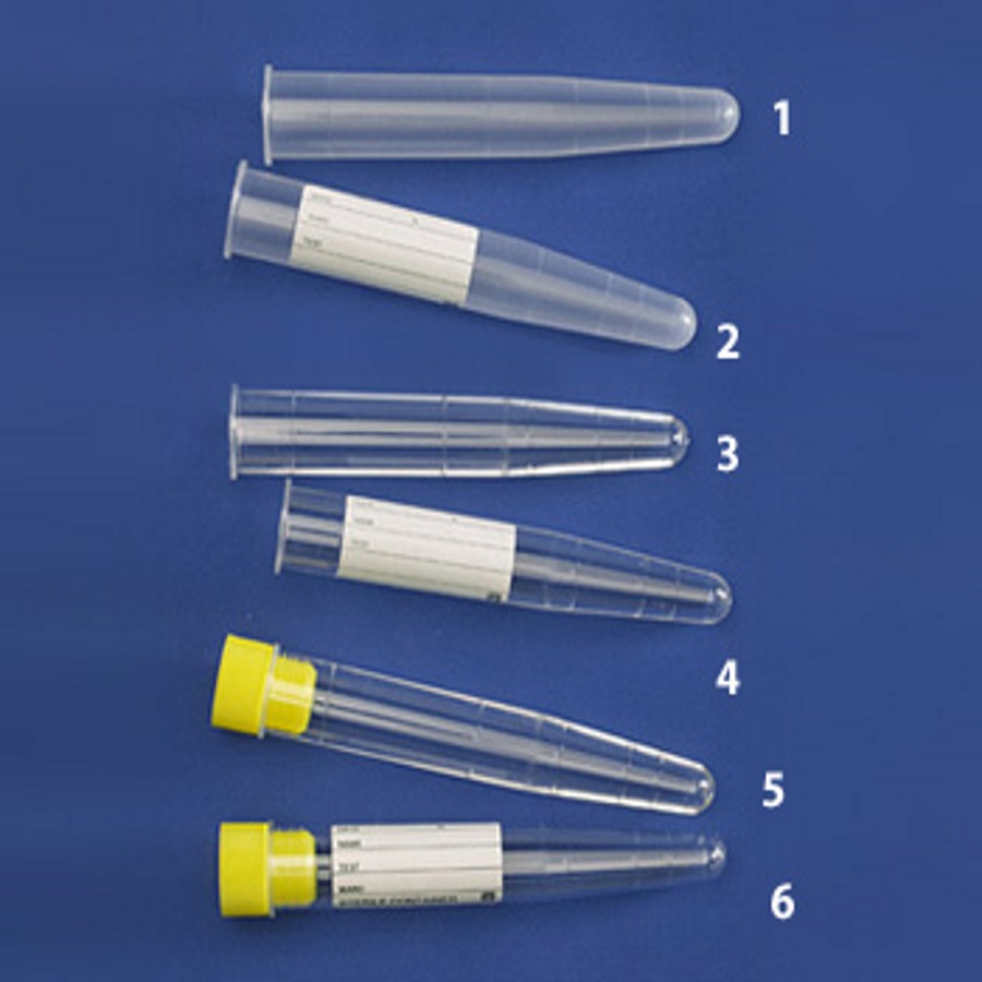 Przeźroczyste probówki o poj. 10 ml wykonane z PS lub 15 ml wykonane z PP, ze stożkową podstawą, samostojące, z zakrętką wykonaną z HDPE.