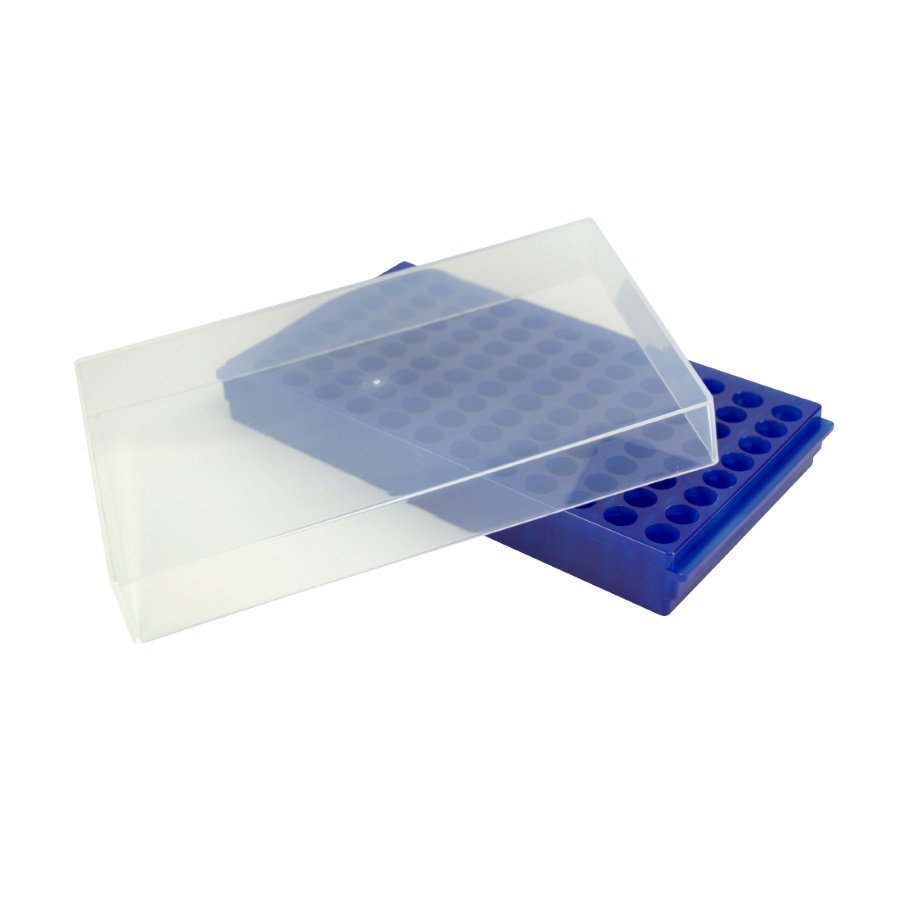 Statywy z przeźroczystą pokrywką. Przeznaczone na 96 szt. (8 x 12) probówek 0,2 ml lub na probówki w paskach. Odporne na temperatury od -80 do +121°C. Mogą być układane w stosy. Wykonane z PP.