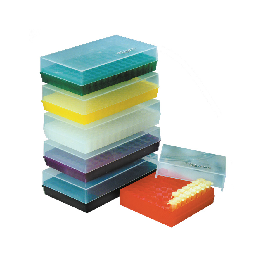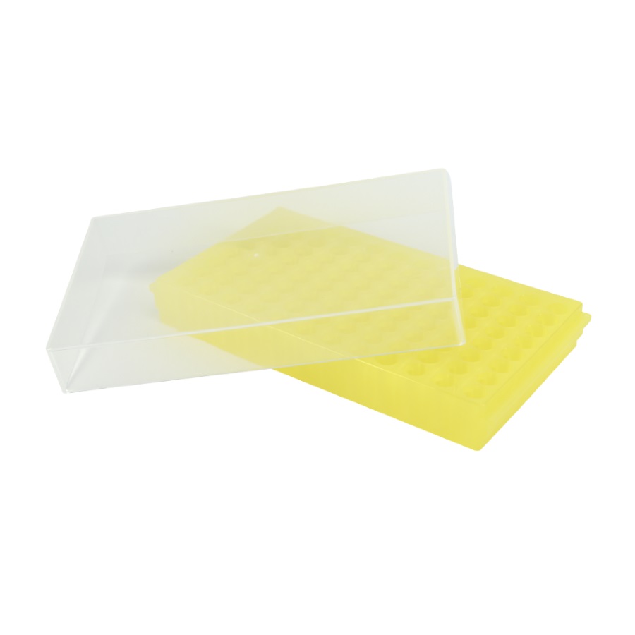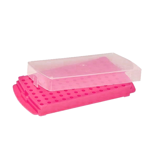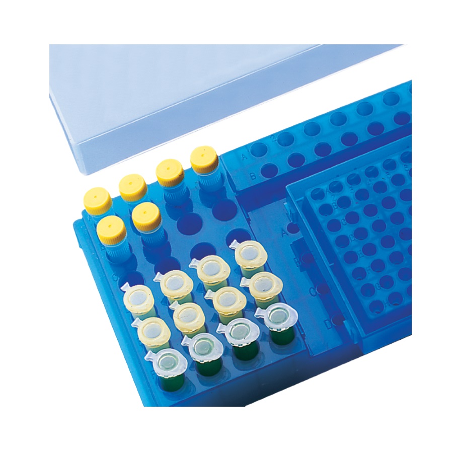 Statyw przeznaczony na różne rozmiary probówek. Stabilny, wykonany z polipropylenu. Z przeźroczystą pokrywką z PP. Możliwość ustawiania piętrowego. Posiada 24 otwory na probówki o poj. 1,5 ml, 16 otworów na probówki o poj. 0,5 ml oraz wyjmowany wkład na 96 probówek PCR (8 x 12). Autoklawowalny do 121°C.
