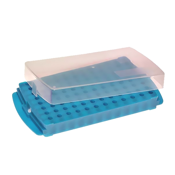 Dwustronny statyw na probówki z pokrywką. Na górnej stronie znajdują się otwory na probówki o poj. 1,5 i 2 ml, na dolnej – miejsca na probówki o poj. 0,5 ml. Wykonany z PP. Autoklawowalny do 121°C. Dostępny w 7 kolorach.