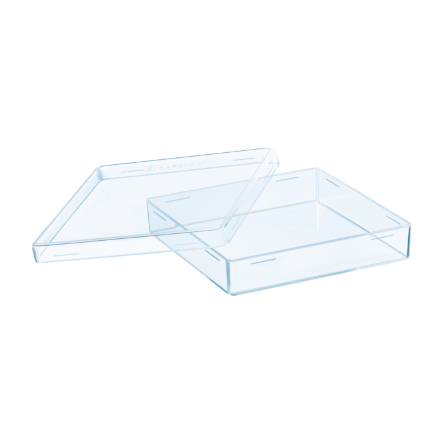 Kwadratowe szalki Petriego Sarstedt wykonane z PS. Sterylne. Szalki mają podstawę o wymiarach 100 x 100 mm. Ich wysokość to 20 mm.