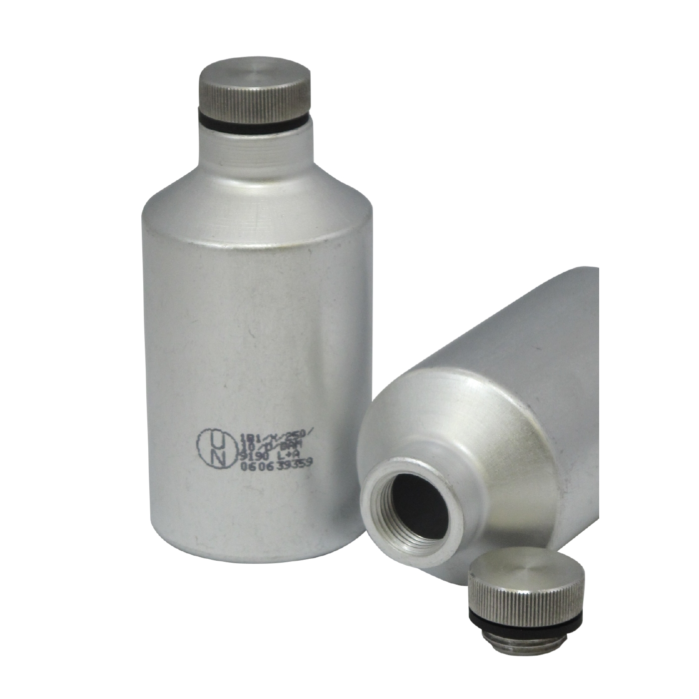 Aluminiowe butelki z dopuszczeniem UN. Wykonane bez spoin z czystego aluminium (Al 99,5% wg DIN 1712). Na zewnątrz i wewnątrz w kolorze srebrno-matowym. Odznaczają się nieprzepuszczalnością dla światła, niewielką masą i wysoką trwałością. Posiadają aluminiowy zakręcany korek z uszczelką z tworzywa PTFE i gumowym rdzeniem. Każda pojedyncza butelka jest sprawdzana pod względem szczelności. Grupa opakowania I (X).