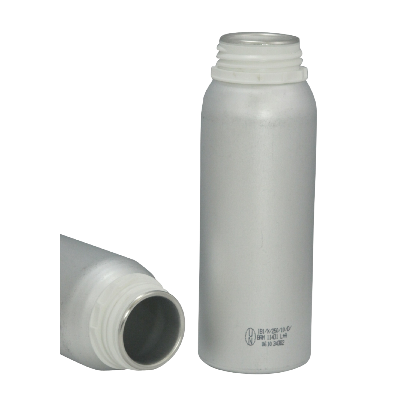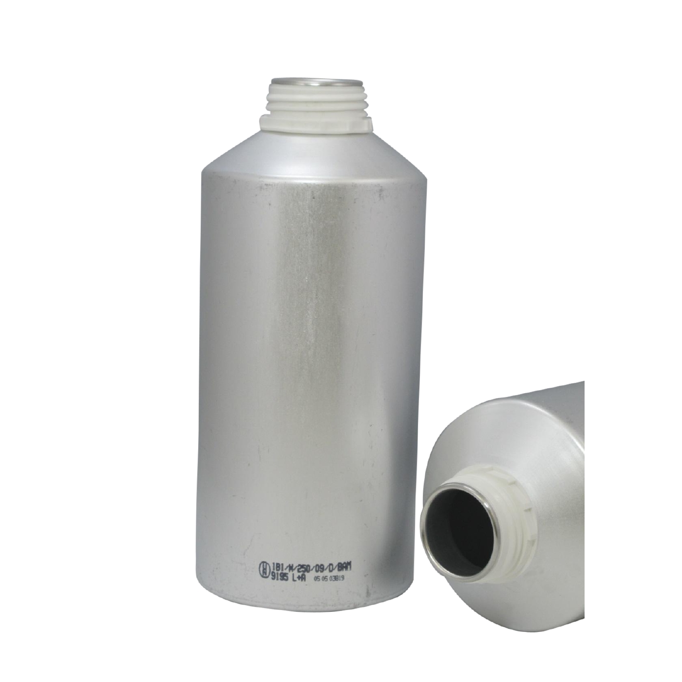 Wykonane z czystego aluminium 99,5%, zgodnie z normą DIN EN 573 bez spoin. Dopuszczone do transportu materiałów niebezpiecznych. Sprawdzone pod względem szczelności i oznaczone kodem kontrolnym. Wewnątrz i na zewnątrz barwione na srebrny mat. Gwint zewnętrzny z PE z gładkim przejściem szyjki. Nakrętka z PE, samoplombująca, wyposażona w uszczelkę piankową z polietylenu. Grupa opakowaniowa I (X). Butelki nie są autoklawowalne.
