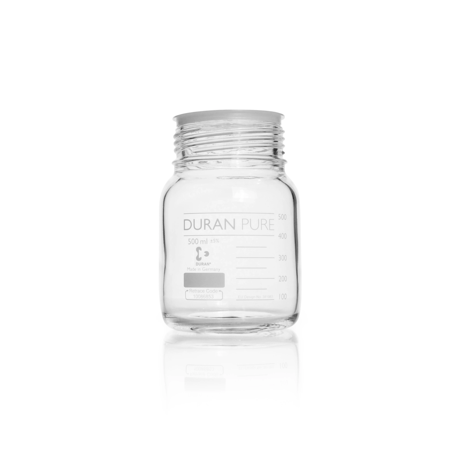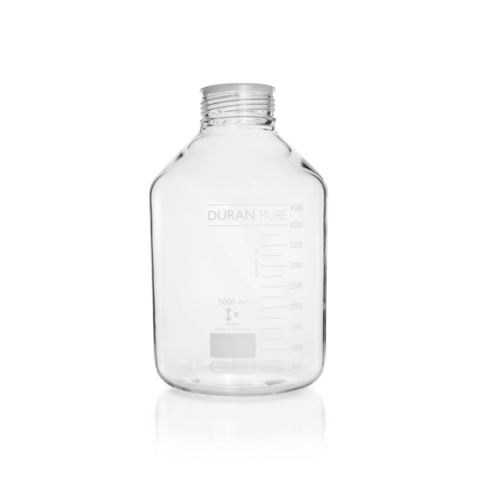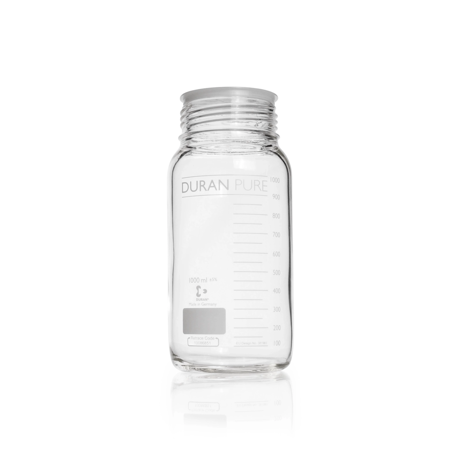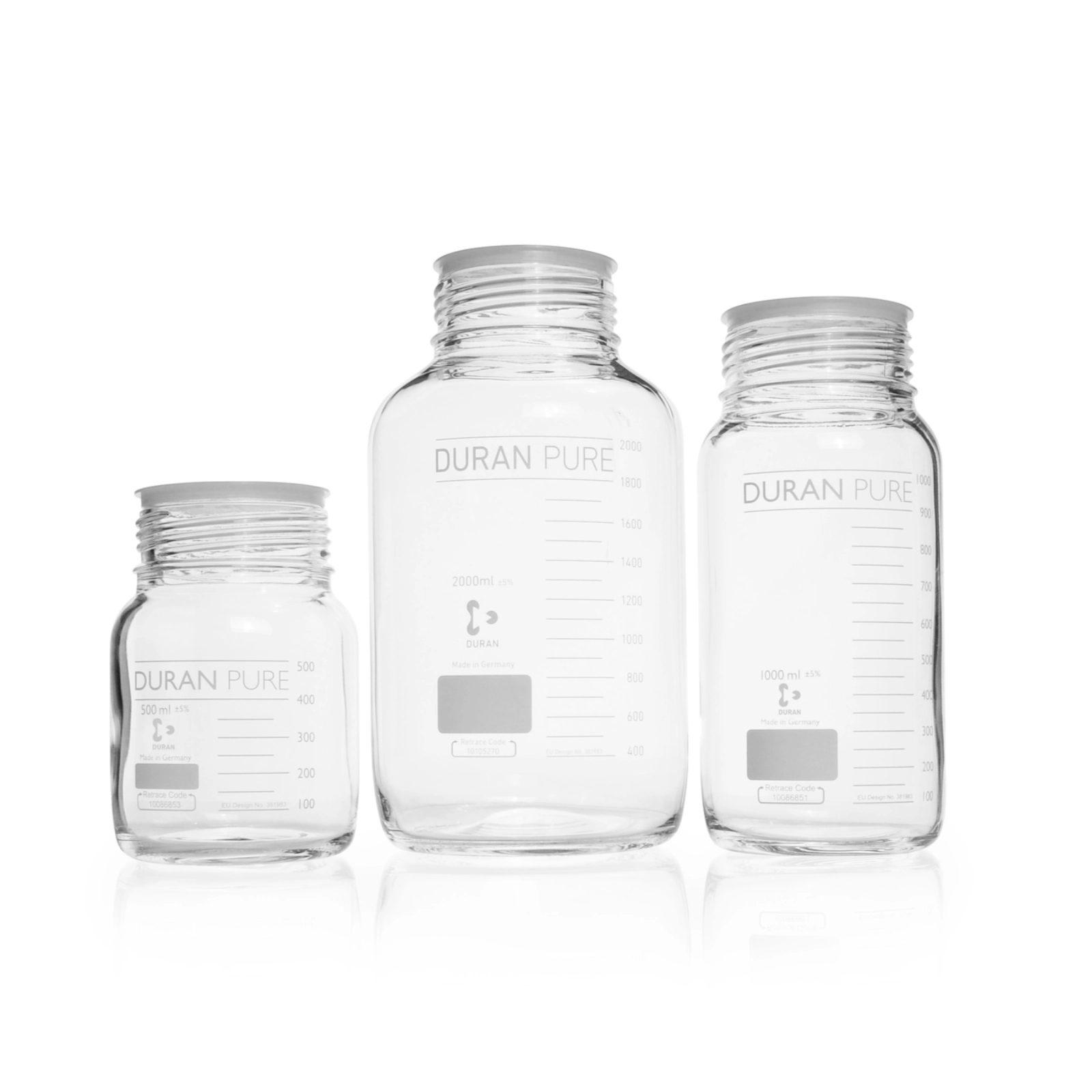 Butelki laboratoryjne Duran® Pure z bezbarwnego szkła borokrzemianowego. Ze standardowym gwintem, bez zakrętek i pierścieni wylewowych, zamykane pokrywkami ochronnymi. Opracowane na potrzeby przemysłu farmaceutycznego. Z certyfikatem analizy (CoA). Autoklawowalne.