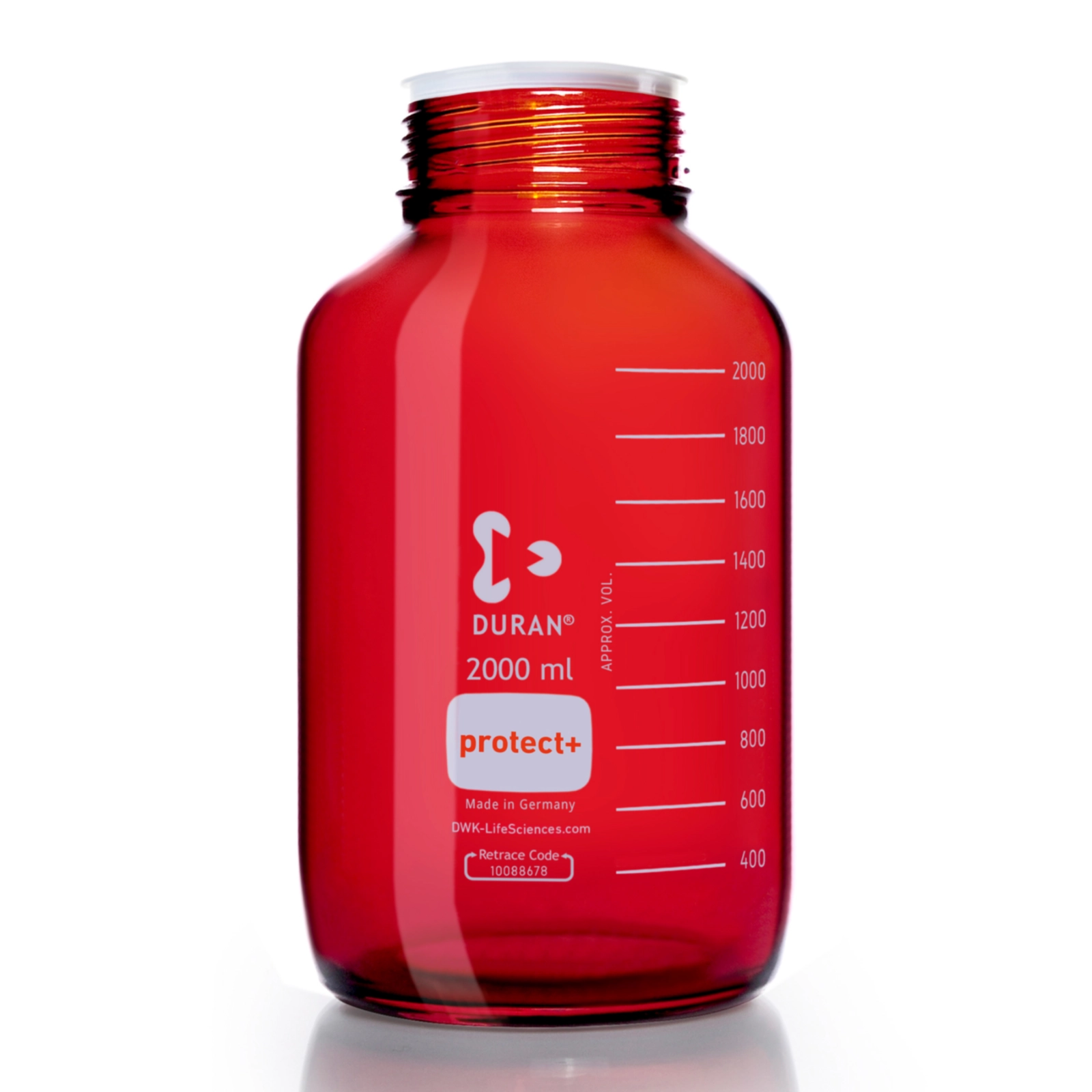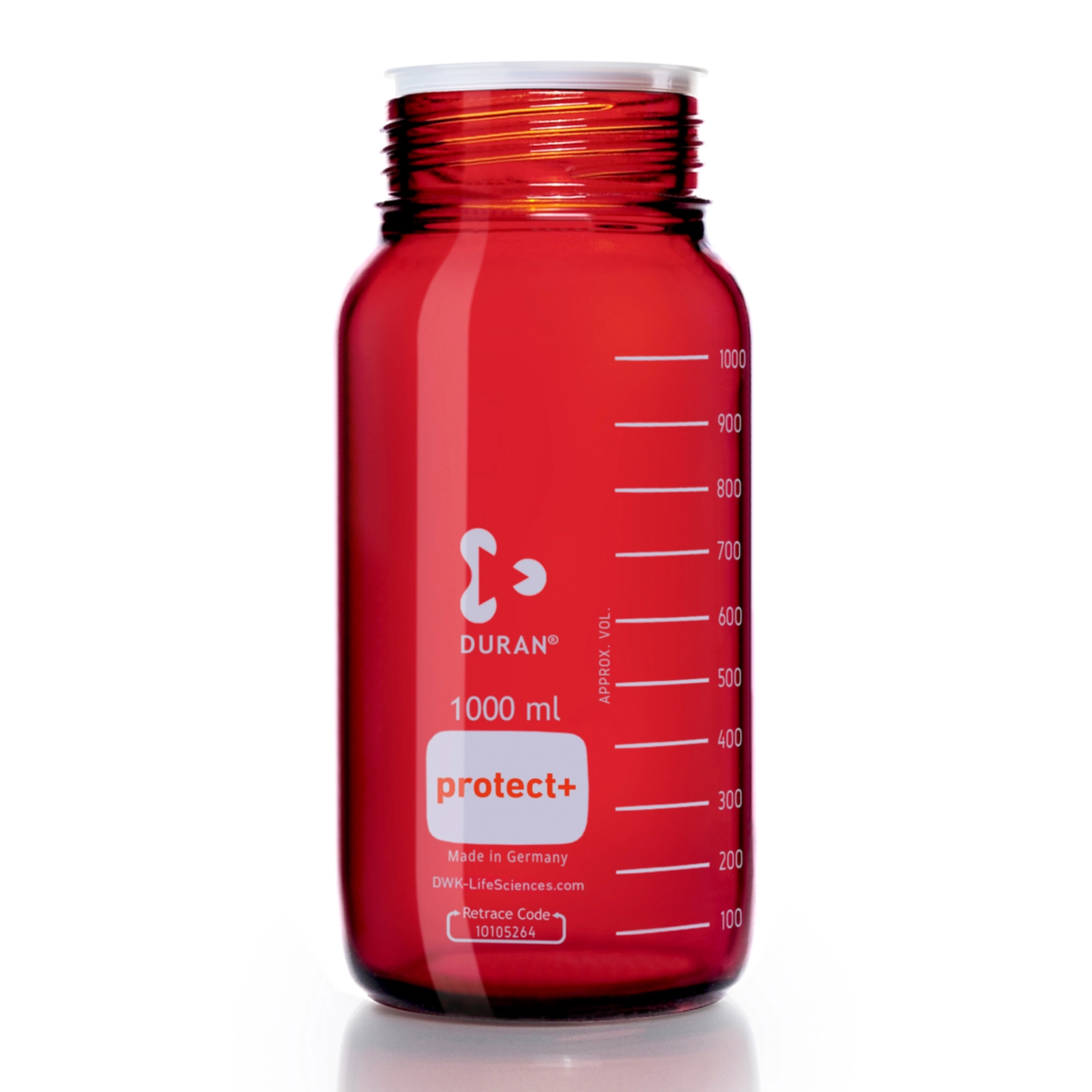 Oranżowe butelki Duran protect+ są wykonane z bezbarwnego szkła Duran® z szeroką szyją GLS80, pokryte od zewnątrz warstwą bursztynową, a następnie ochronną powłoką polimerową (PA 12). Powłoka poliamidowa chroni przed zarysowaniami i uszkodzeniami mechanicznymi, a w przypadku stłuczenia butelki o pojemności do 2 litrów, zabezpiecza przed utratą cieczy, nie dopuszczając do rozpryśnięcia szkła. Oferowane z nakładaną na szyjkę osłoną przeciwpyłową, bez zakrętki i pierścienia wylewowego.