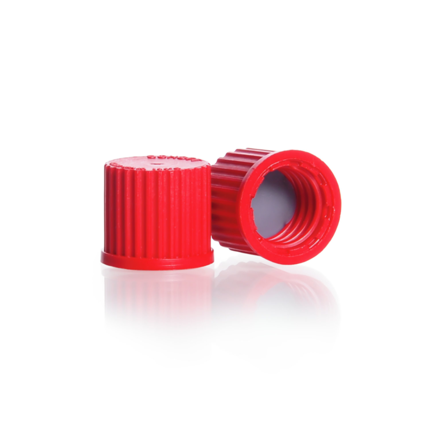 Zakrętki z gwintem GL 18 i septą z silikonu/PTFE. Wykonane z czerwonego PBT. Przeznaczone do zamykania nieużywanych portów GL 18 w zakrętkach Duran GLS 80 z 4 portami GL 18 (G-0418). Opakowanie zawiera 2 szt.