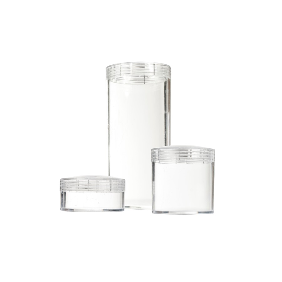 Pojemniki wykonane z przeźroczystego polistyrenu, umożliwiającego natychmiastową identyfikację zawartości. Z gwintowanymi pokrywkami. Służą głównie do przechowywania mediów proszkowych. Odporne na temperatury od -40°C do +75°C.