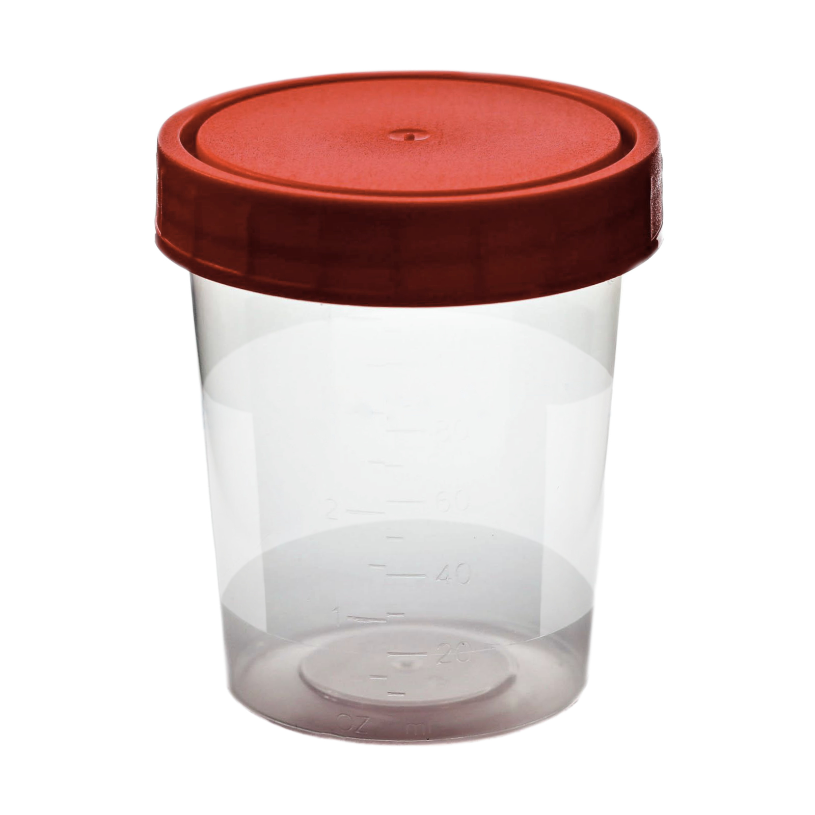 Stabilne i wytrzymałe, przeźroczyste pojemniki z PP. Z podziałką. Pojemność 100 ml. Kolorowa, szczelna pokrywka wykonana z tworzywa HDPE (niesterylna) lub LDPE (sterylna). Odporne na zgniatanie i pęknięcia. Posiadają pole do opisu oraz matową powierzchnię opisową na pokrywce.