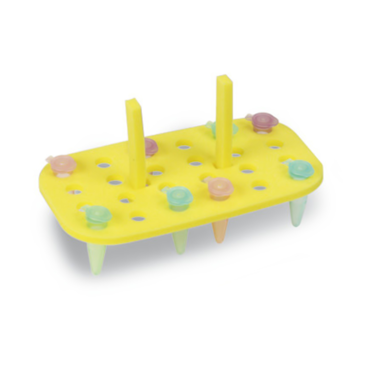 Niedrogi stojak na probówki o poj. 1,5 ml. Wykonany z polipropylenu. Przeznaczony do łaźni wodnych. Z uchwytem ułatwiającym zanurzanie i wyjmowanie z wody. Możliwość autoklawowania do 121°C.