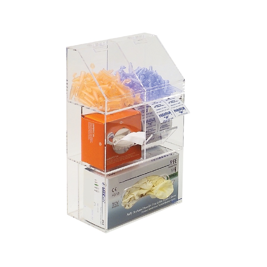 Przeźroczysty pojemnik dozujący na drobny asortyment laboratoryjny np. końcówki do pipet, strzykawki jednorazowe, probówki i inne przedmioty z metalu lub ze szkła. Wykonany z wytrzymałego plastiku akrylowego o gr. 3 mm. Pojemnik napełnia się od góry podnosząc pokrywkę. Przedmioty wyjmowane są z przegródek w części przedniej. Chroni przed zakurzeniem.