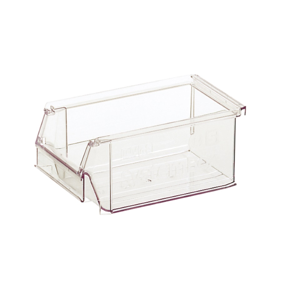 Wykonany z przeźroczystego polistyrenu, co pozwala na natychmiastową identyfikację zawartości. Z dużym otworem ułatwiającym dostęp do przechowywanych przedmiotów. Możliwość ustawiania piętrowego. Stabilny. Z szerokim polem na etykietę opisową oraz wgłębieniami umożliwiającymi wygodny chwyt.