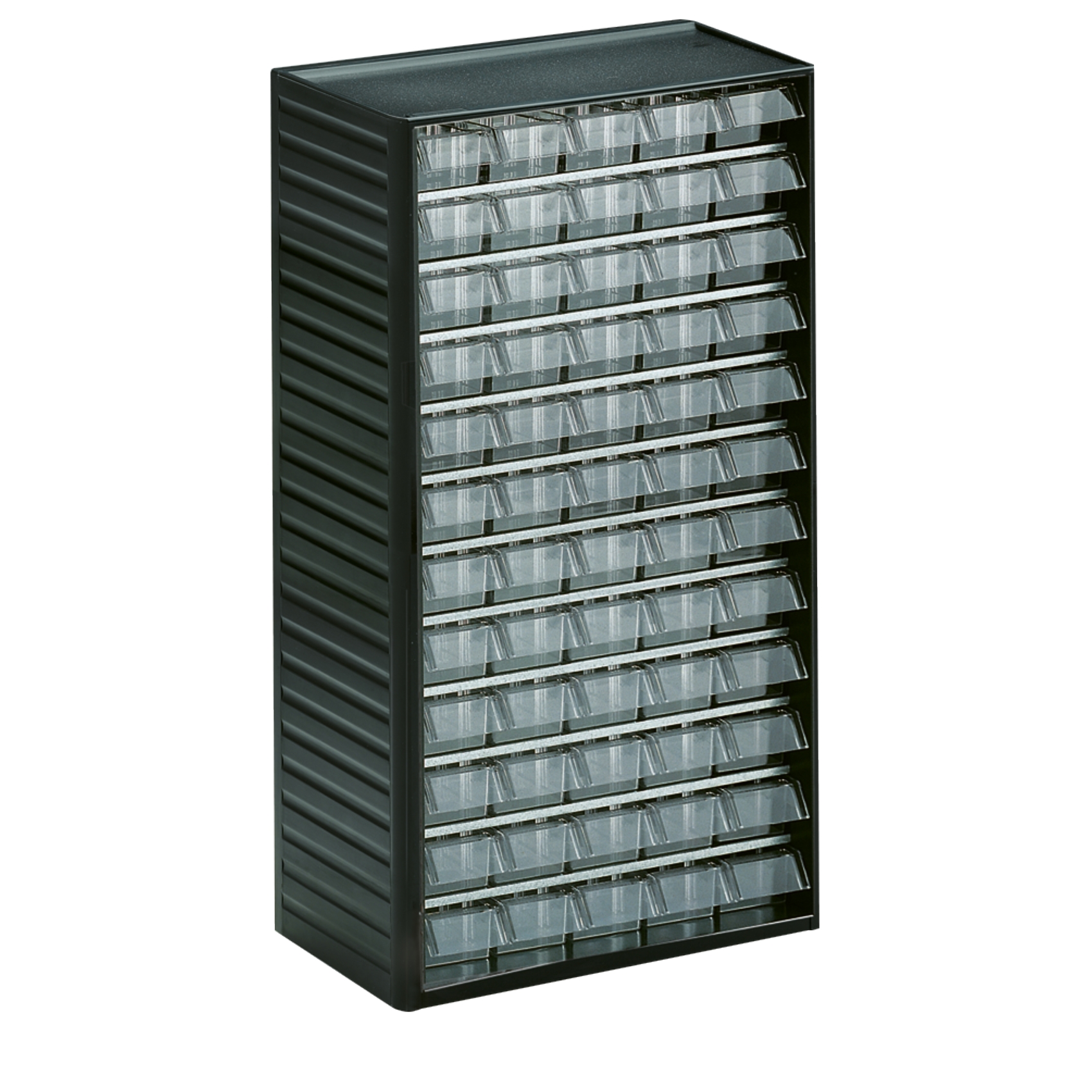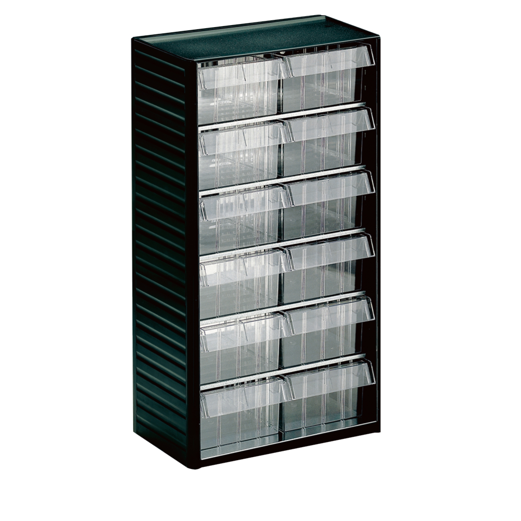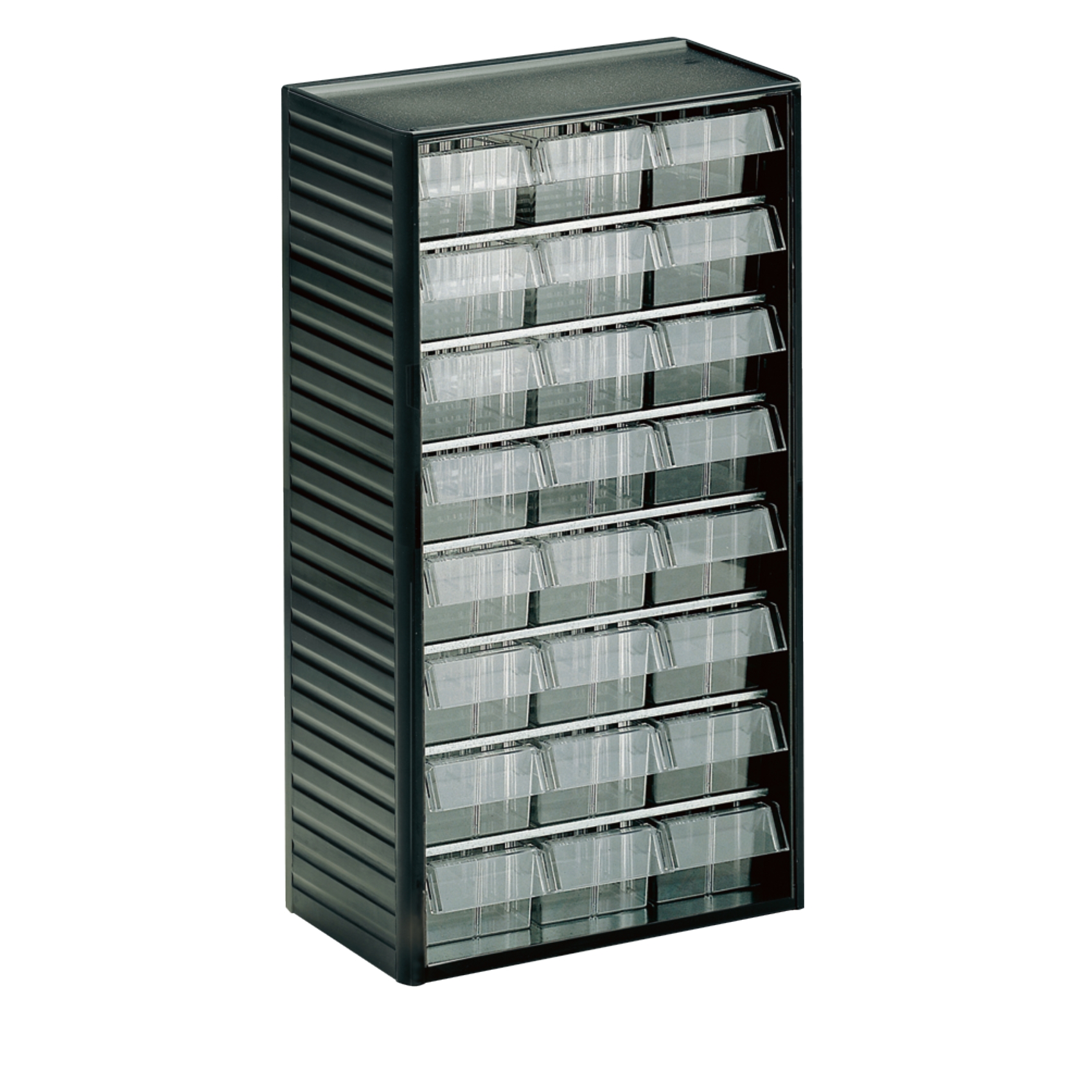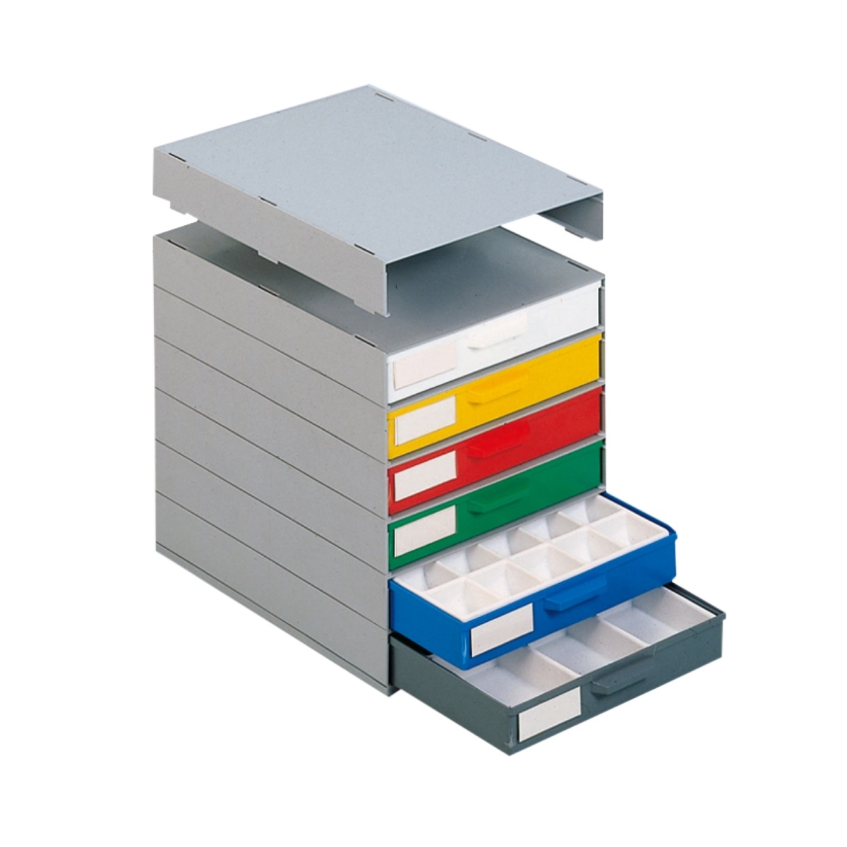 Pojemnik do przechowywania drobnego asortymentu, z opadającą pokrywką. Na górze wyposażony w małe otwory umożliwiające ustawianie w stosy. Wewnątrz znajduje się 11 rowków, w które można wstawić ścianki działowe. Dzięki temu można uzyskać maksymalnie 10 przegródek w odstępie 18 mm i 2 przegródki w odstępie 38 mm. Wykonany z przeźroczystego polistyrenu.