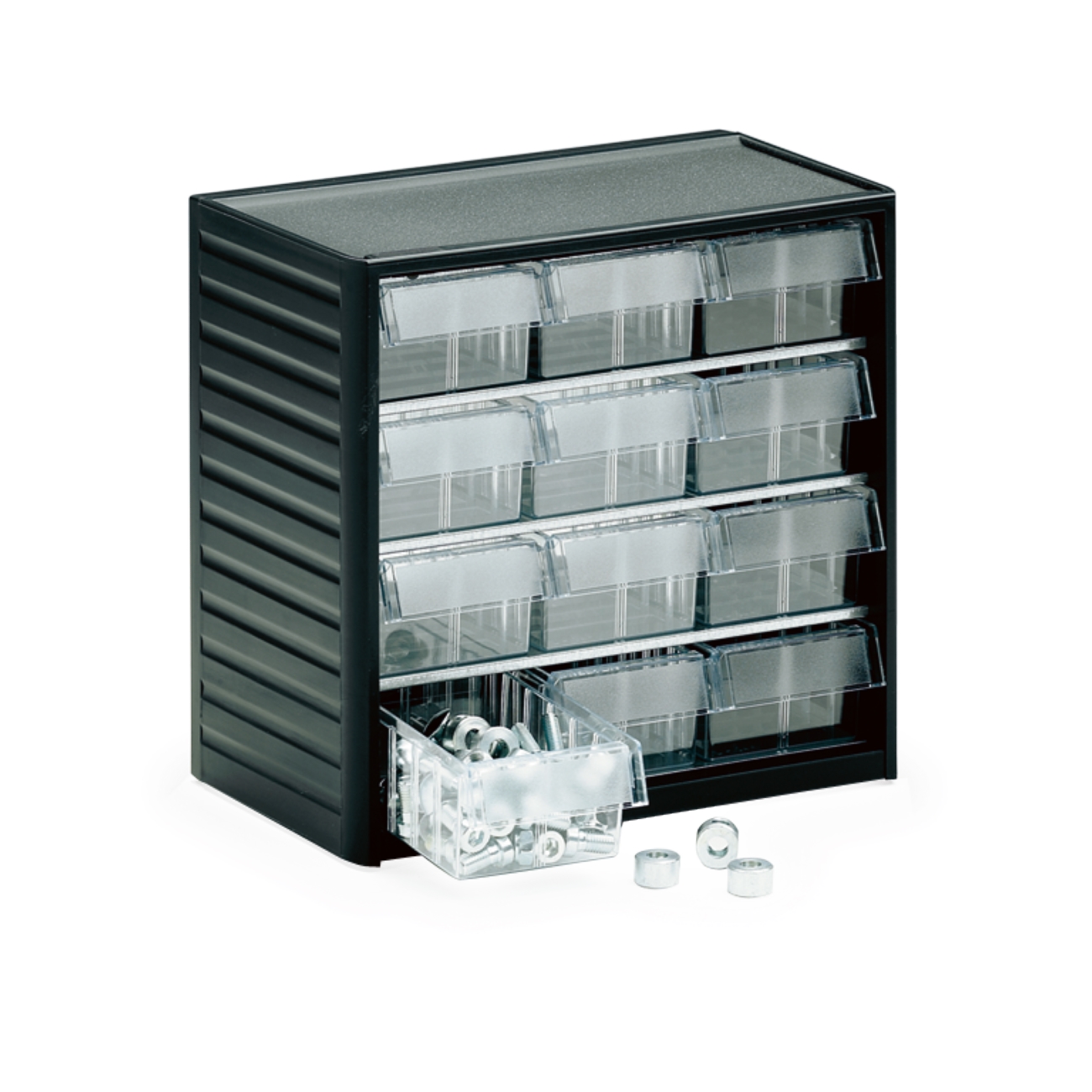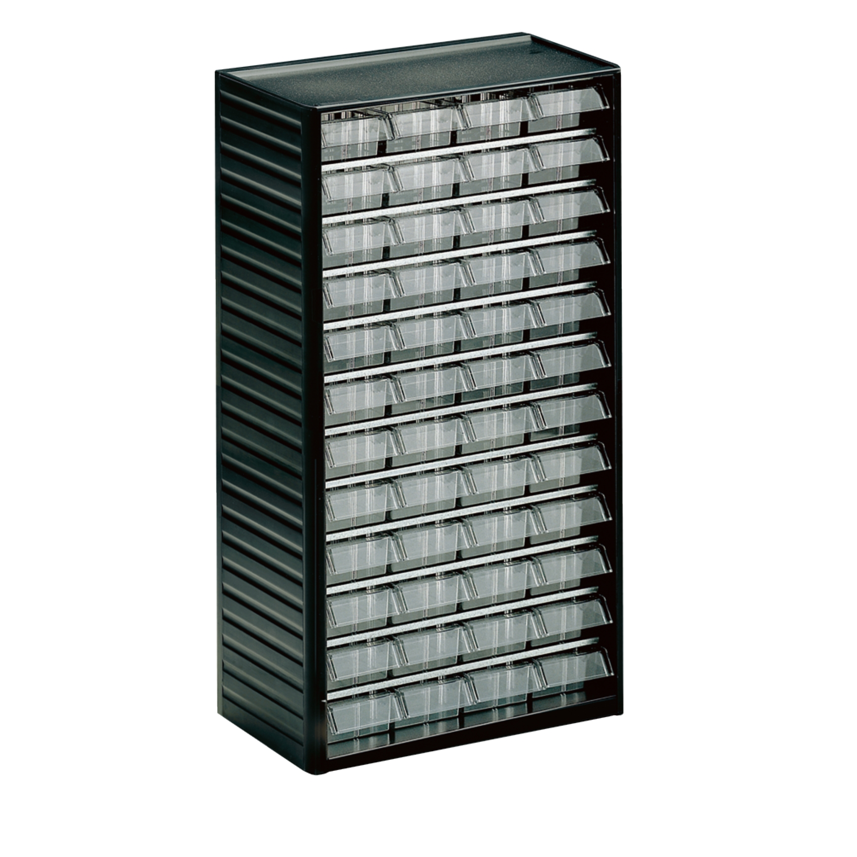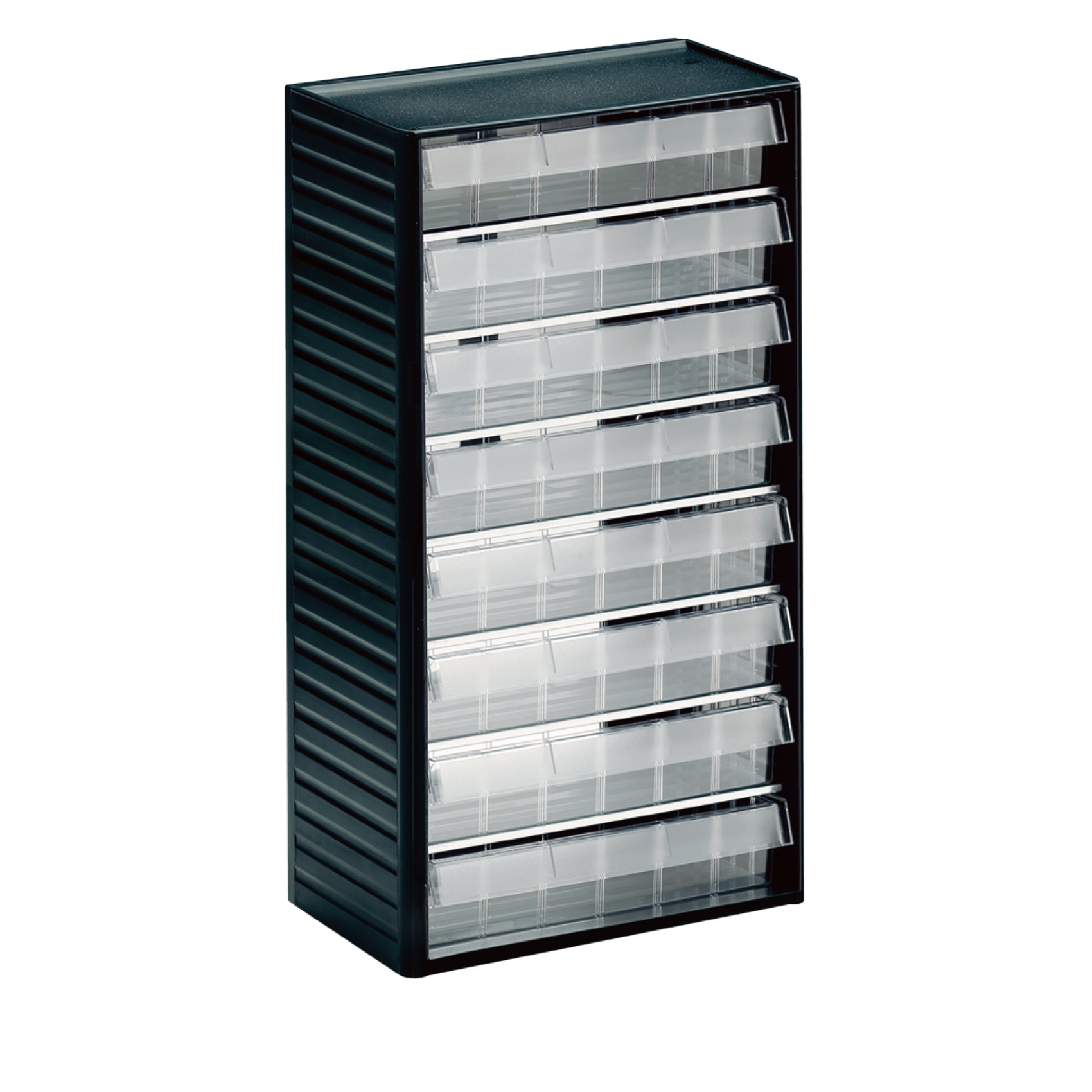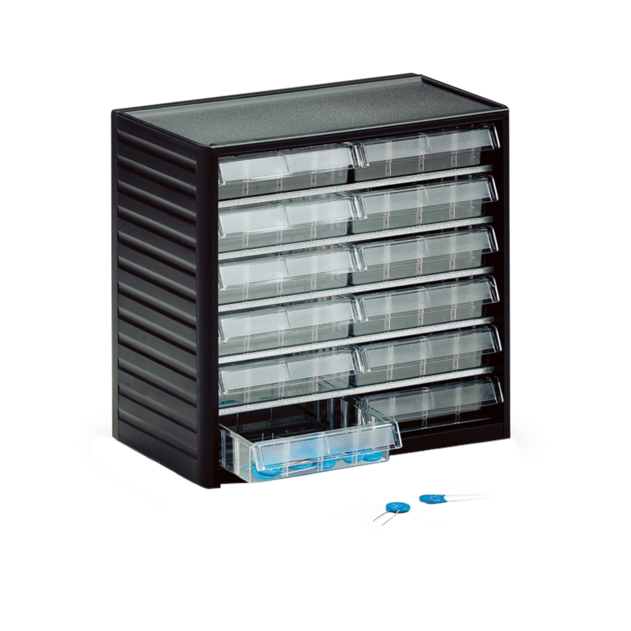 Pojemnik do przechowywania drobnego asortymentu, z opadającą pokrywką. Na górze wyposażony w małe otwory umożliwiające ustawianie w stosy. Wewnątrz znajduje się 11 rowków, w które można wstawić ścianki działowe. Dzięki temu można uzyskać maksymalnie 10 przegródek w odstępie 18 mm i 2 przegródki w odstępie 38 mm. Wykonany z przeźroczystego polistyrenu.
