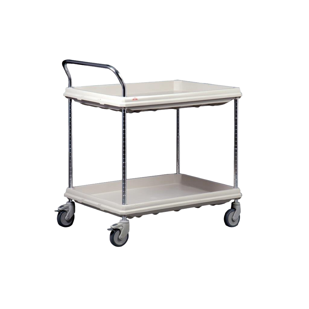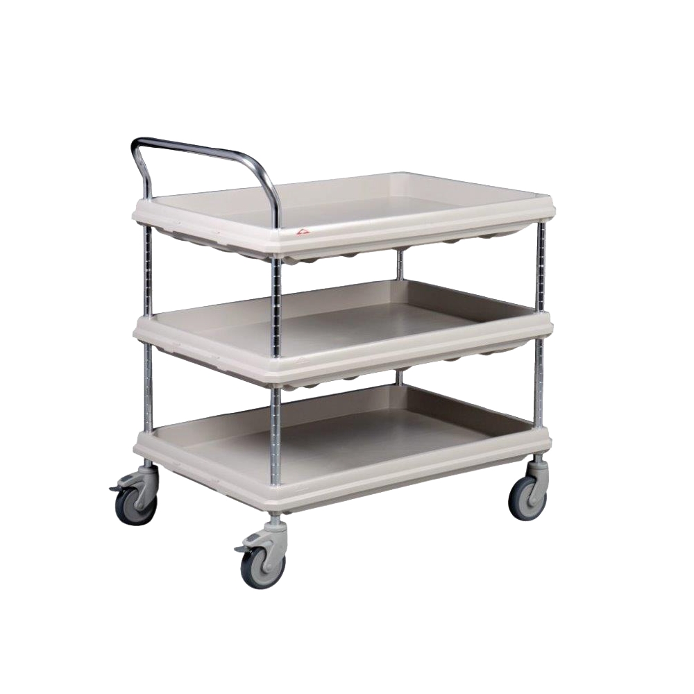 Kompaktowy wózek idealny do wykorzystania w pracowniach o małej powierzchni. Półki wykonane są z polietylenu, z gładką i łatwą do czyszczenia powierzchnią w formie wanny. Wysokie – 70 mm ścianki boczne chronią przed wypadaniem przedmiotów podczas transportu i przed wylewaniem się cieczy. Wysokość półki środkowej może być regulowana (w skokach co 25 mm).
