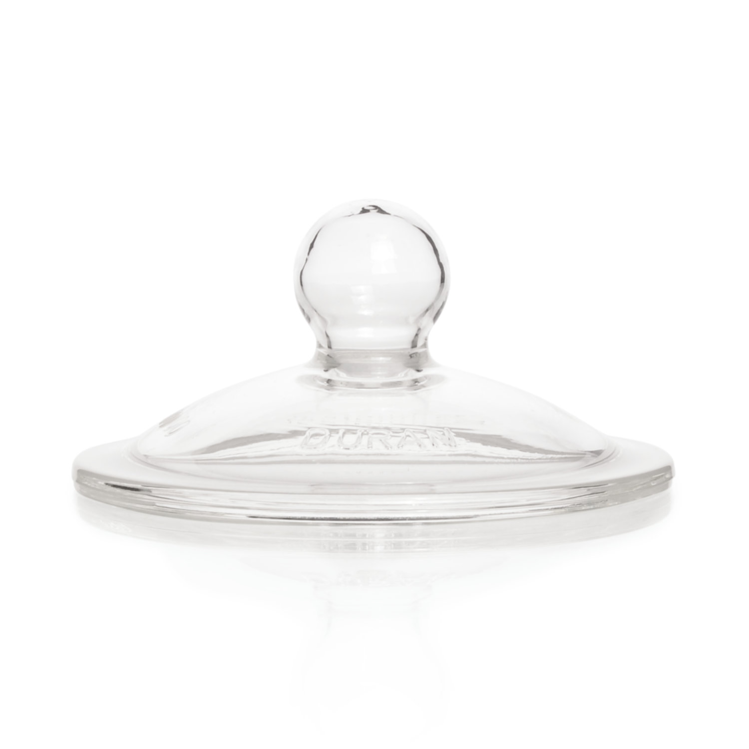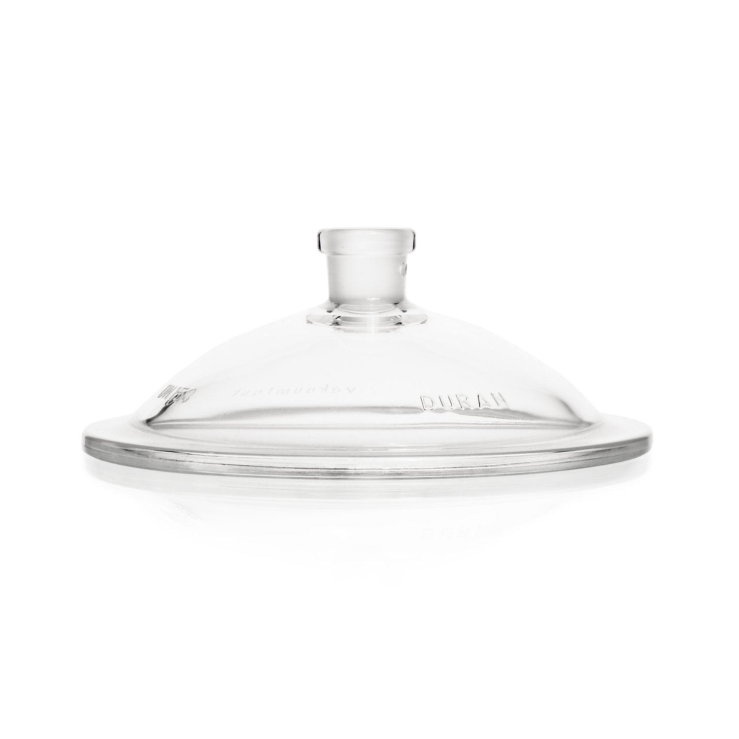 Pokrywa eksykatora ze szkła Duran z uchwytem i szlifowanym kołnierzem. Bez zaworu. Wykonana ze szkła borokrzemowego 3.3. Kompatybilna ze wszystkimi podstawami do eksykatorów Duran.