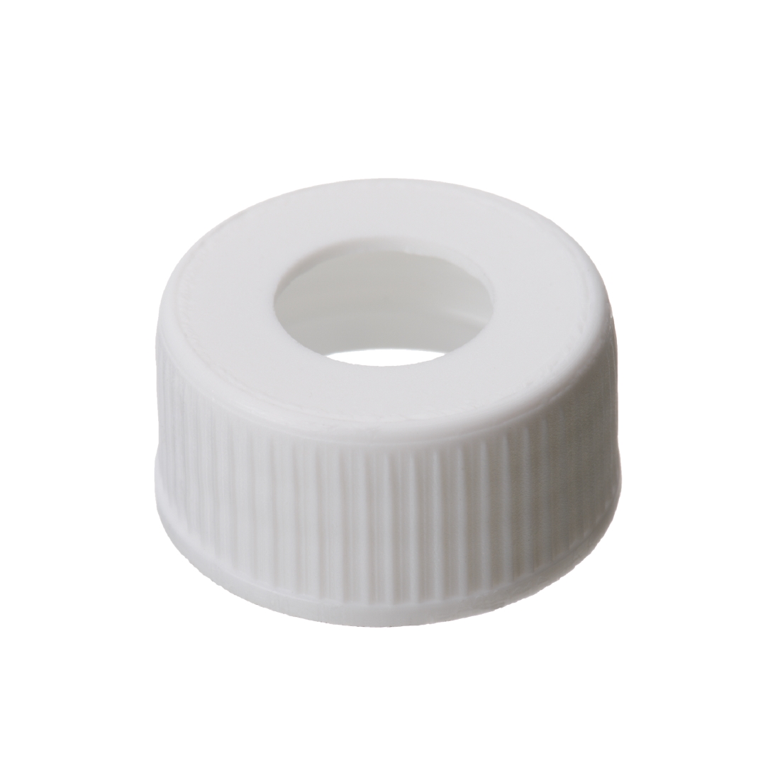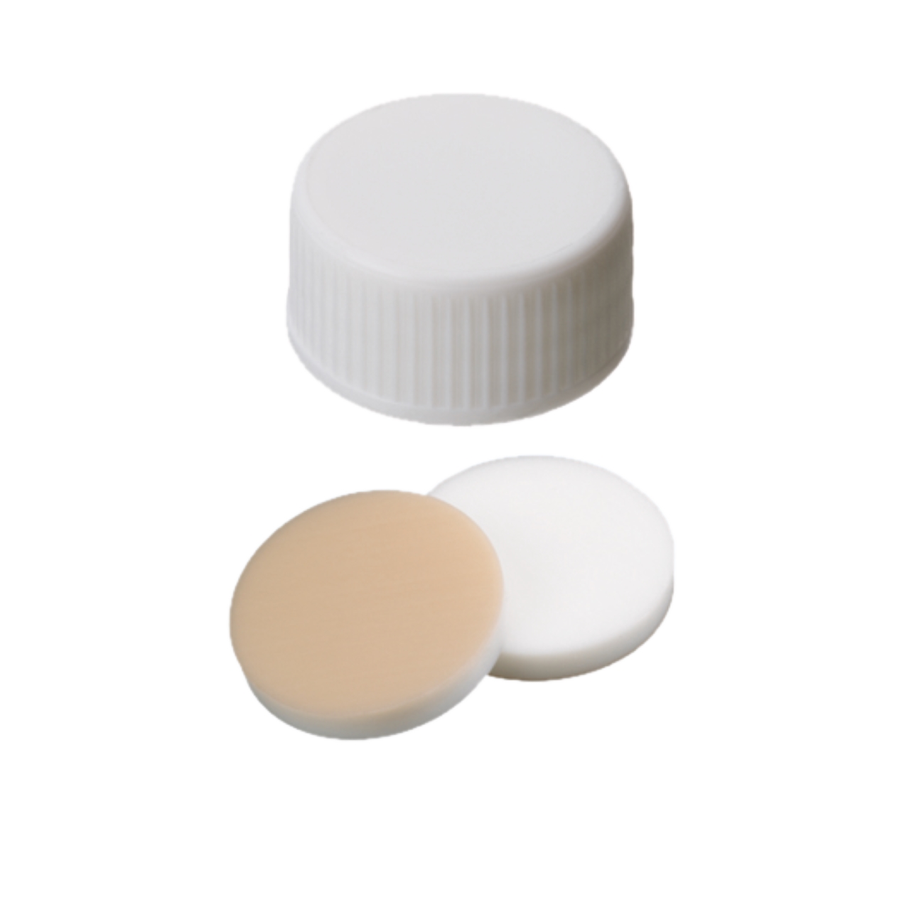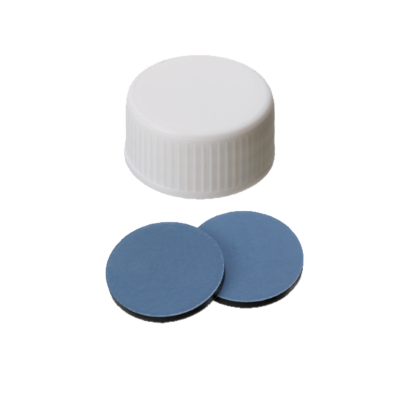 Dzięki temu septa nie wpadnie do fiolki nawet przy nakłuciu tępą igłą. Dostępne są nakrętki gwintowane z PP, z gwintem 24-400, z otworem o Ø 15 mm lub nakrętki zamknięte. Septy z silikonu/z tworzywa PTFE są odporne na temperatury od -60ºC do 200ºC i przeznaczone do jednorazowych iniekcji.