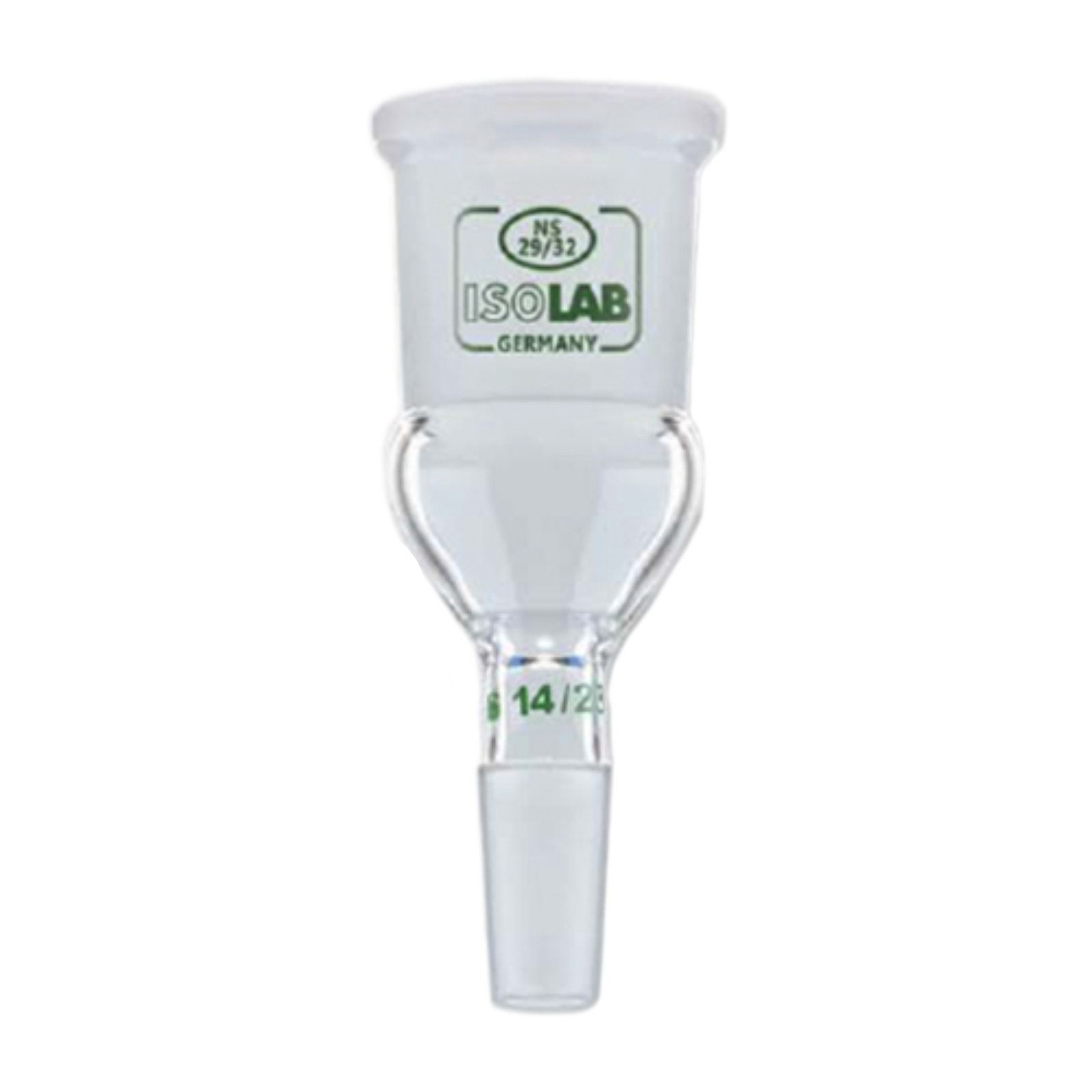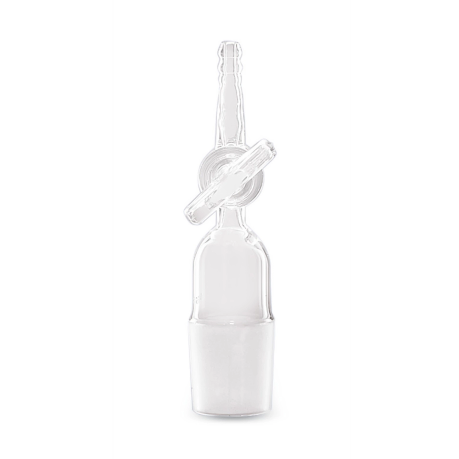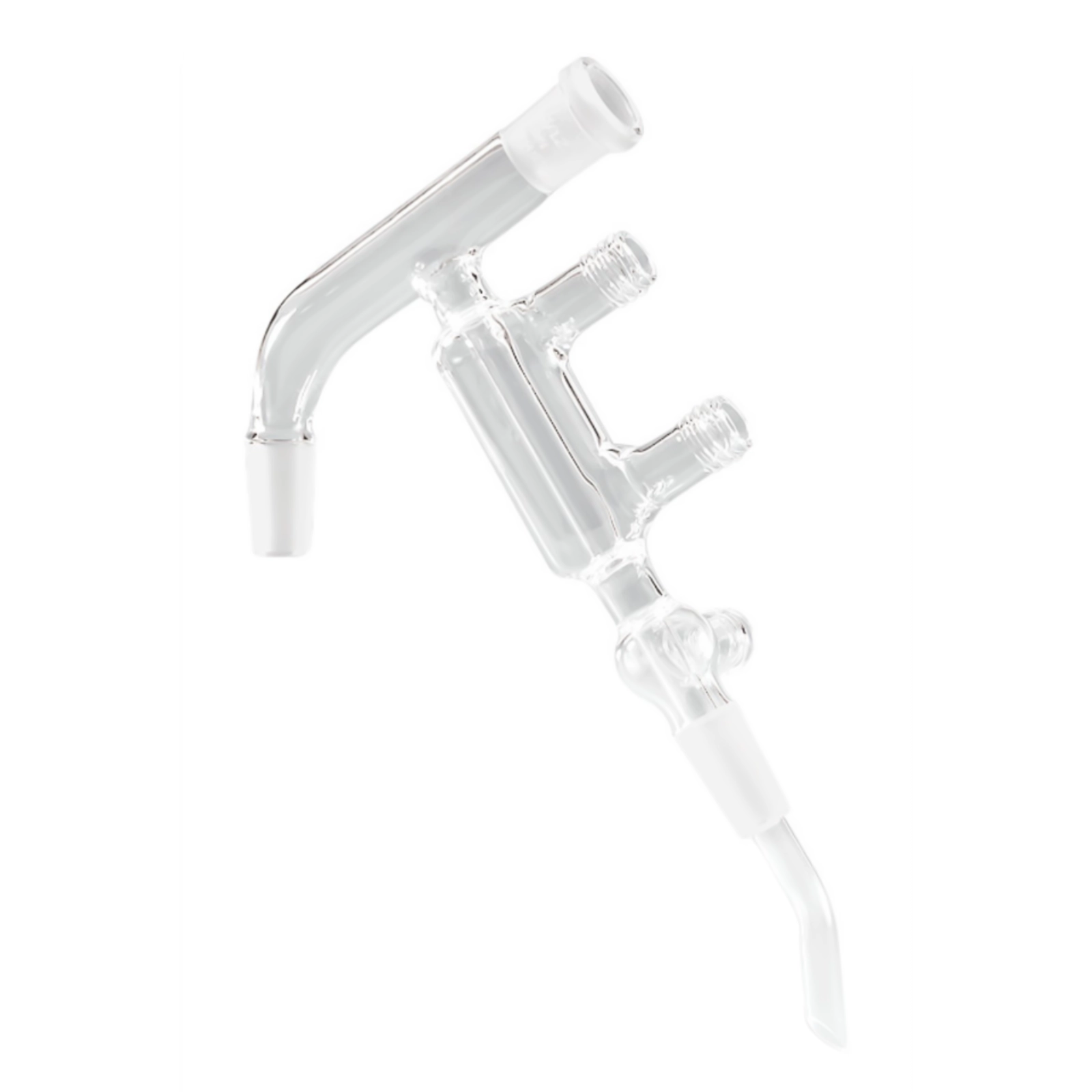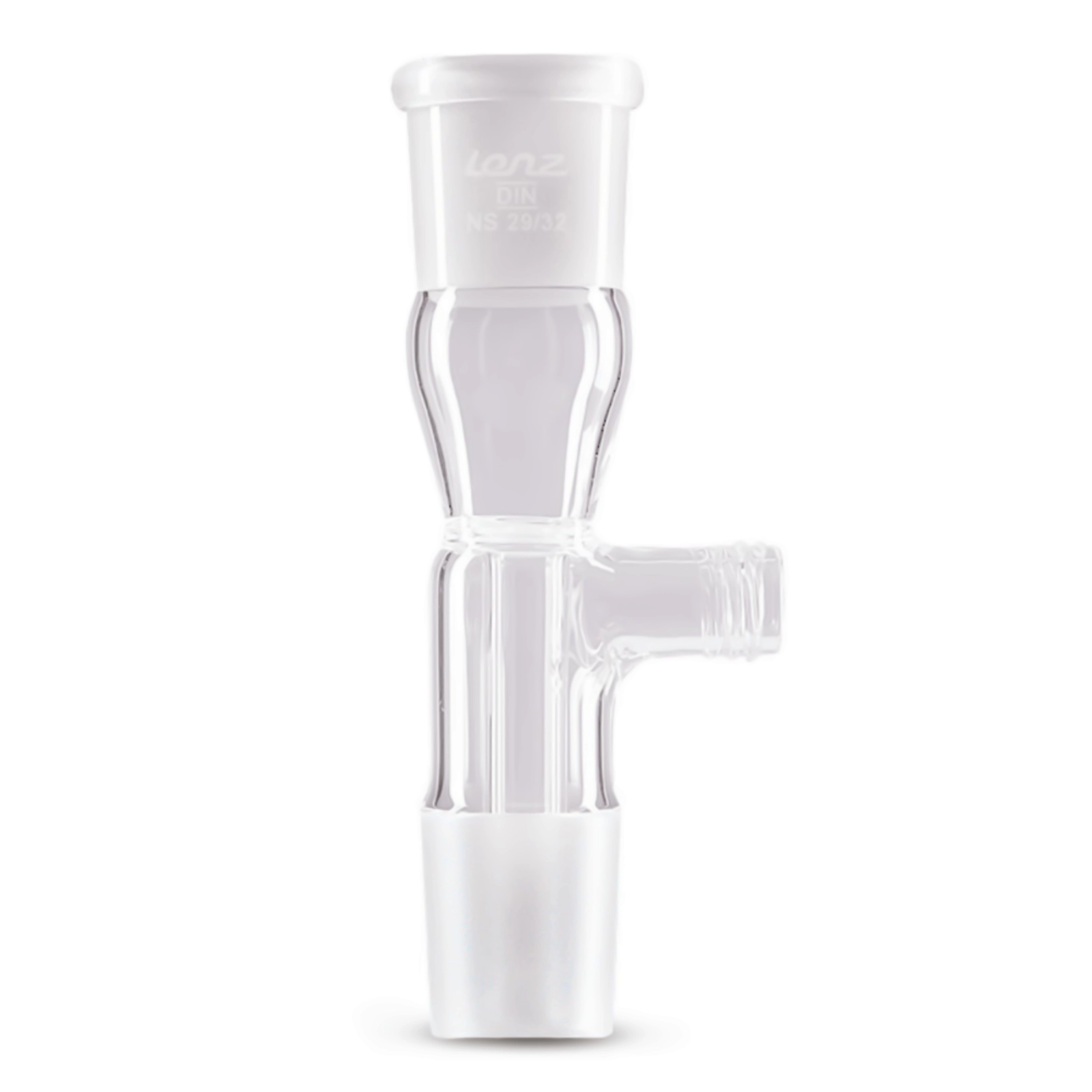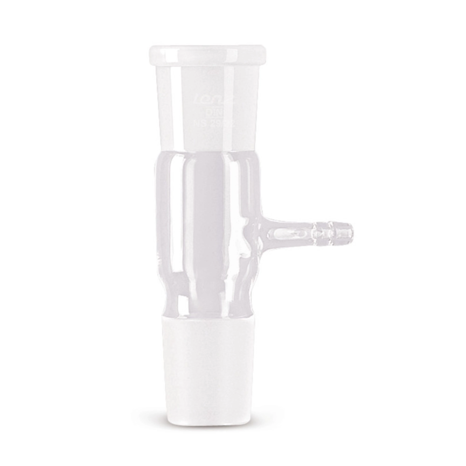 Łącznik wykonany ze szkła Duran® ze szlifem wewnętrznym i zewnętrznym w tym samym rozmiarze. Pomiędzy przyłączami zamontowano dodatkowe wyprowadzenie zakończone szklaną oliwką. Dostępne dla standardowych szlifów NS 14/23, 19/26, 24/29 oraz 29/32.