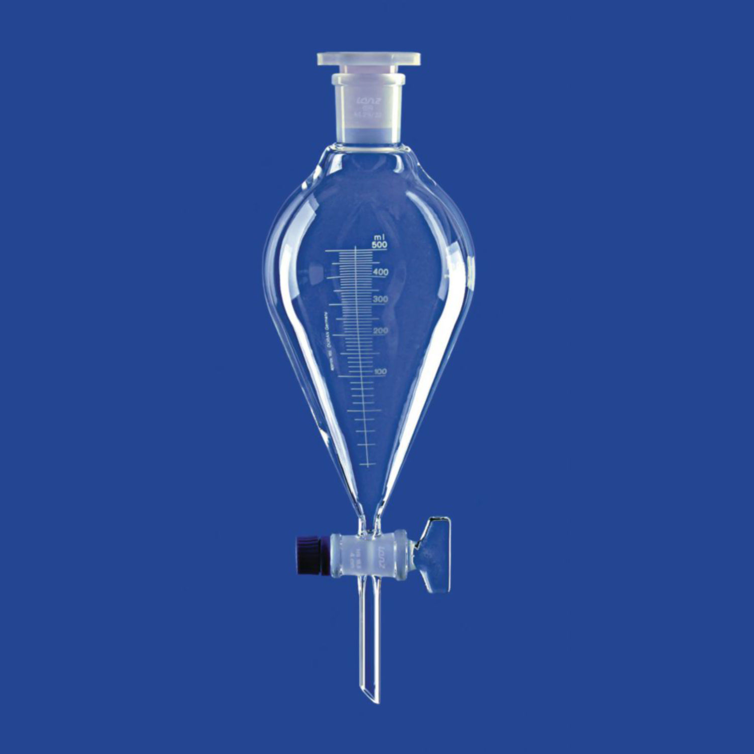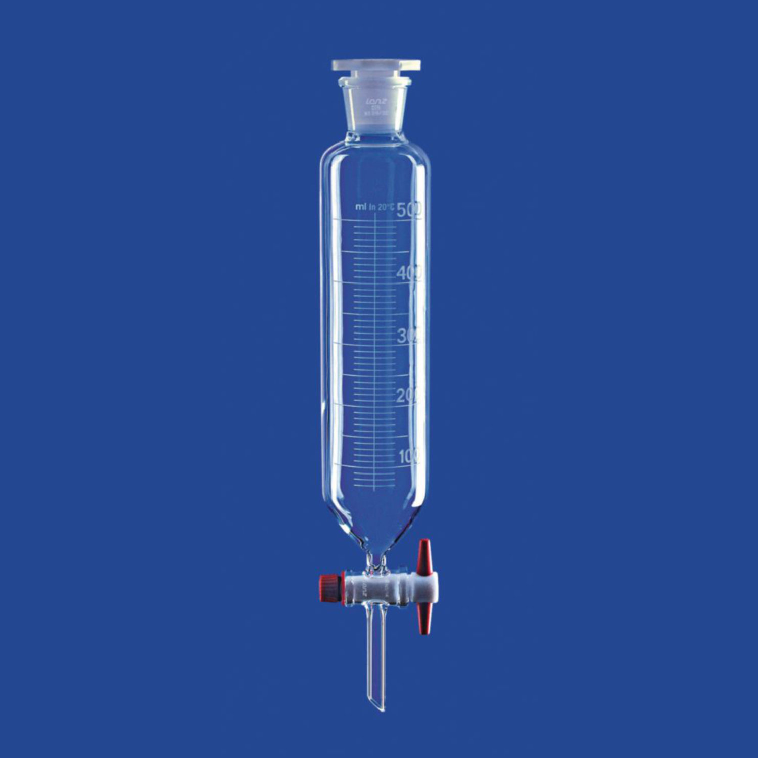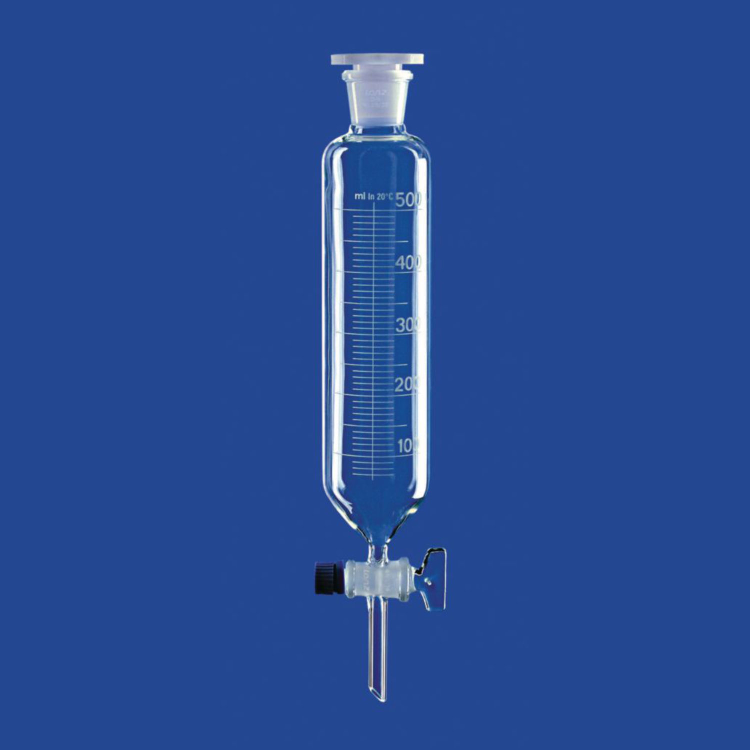 Rozdzielacze o cylindrycznym kształcie, z podziałką i kranem ze szkła lub PTFE. Wykonane ze szkła borokrzemowego 3.3. Z korkiem z PE. Szlif NS 29/32. Pojemność od 50 ml do 1000 ml. Oferowane w opakowaniach po 2 sztuki.