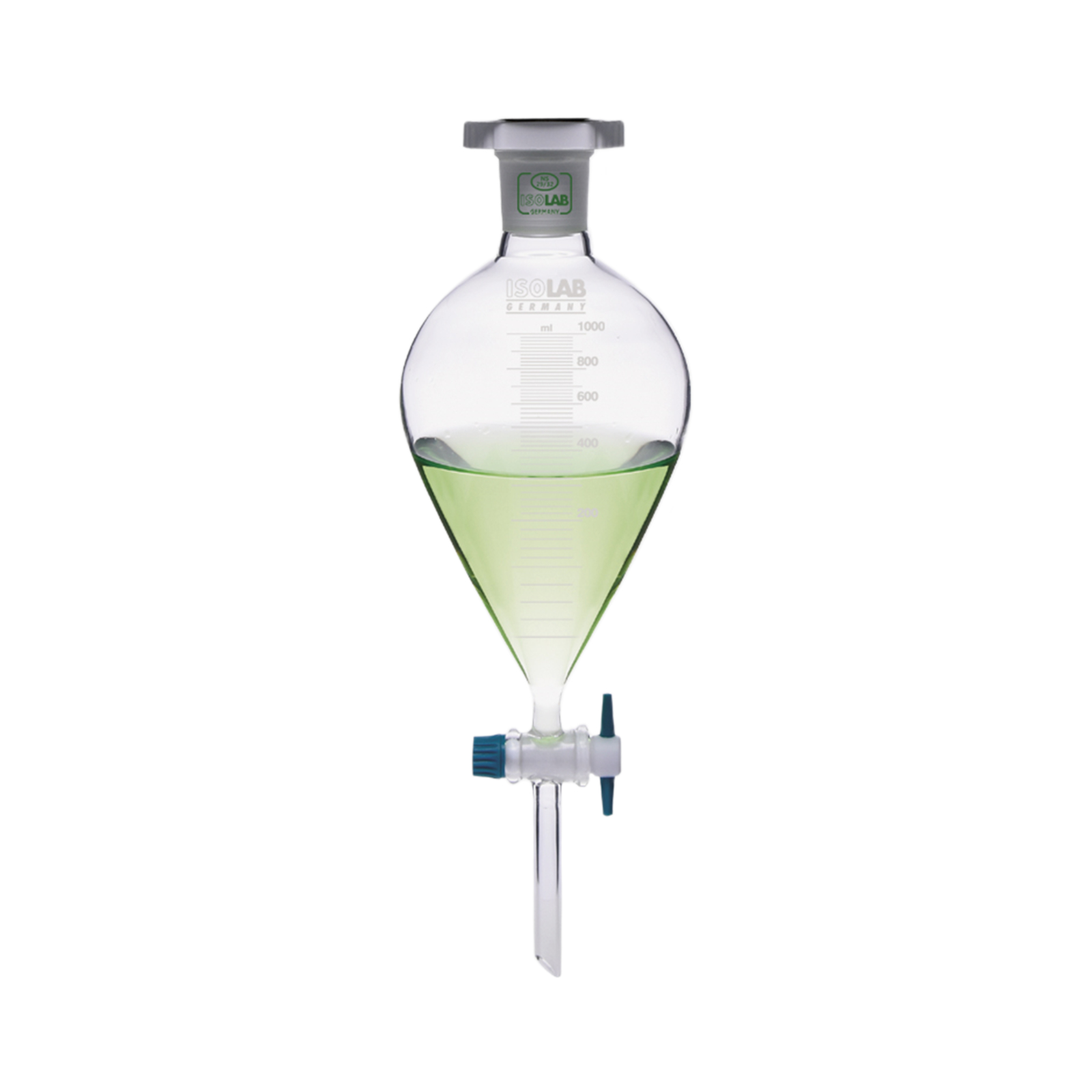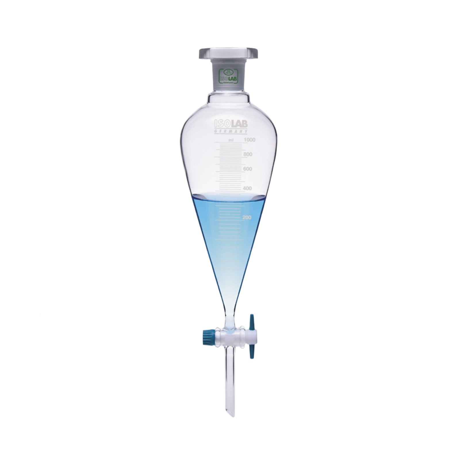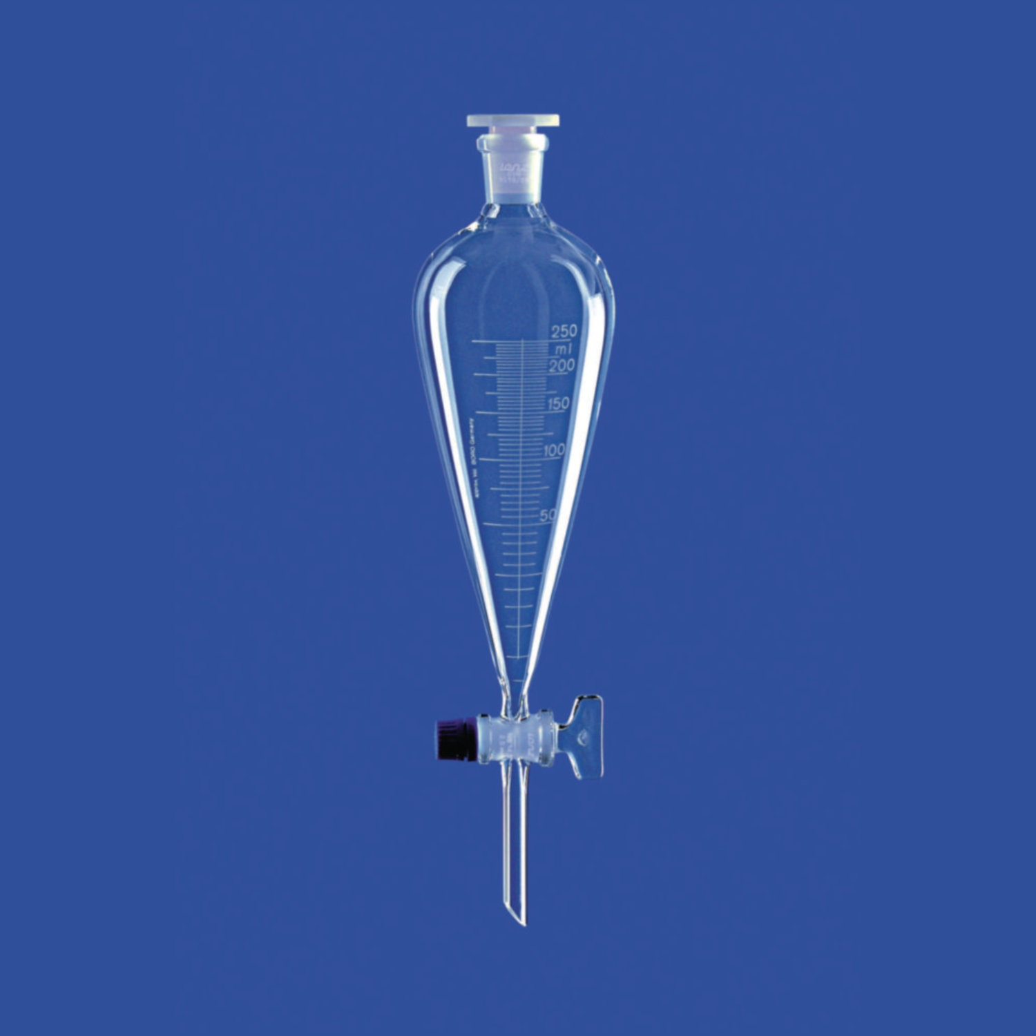 Rozdzielacze o cylindrycznym kształcie, z podziałką i kranem ze szkła lub PTFE. Wykonane ze szkła borokrzemowego 3.3. Z korkiem z PE. Szlif NS 29/32. Pojemność od 50 ml do 1000 ml. Oferowane w opakowaniach po 2 sztuki.