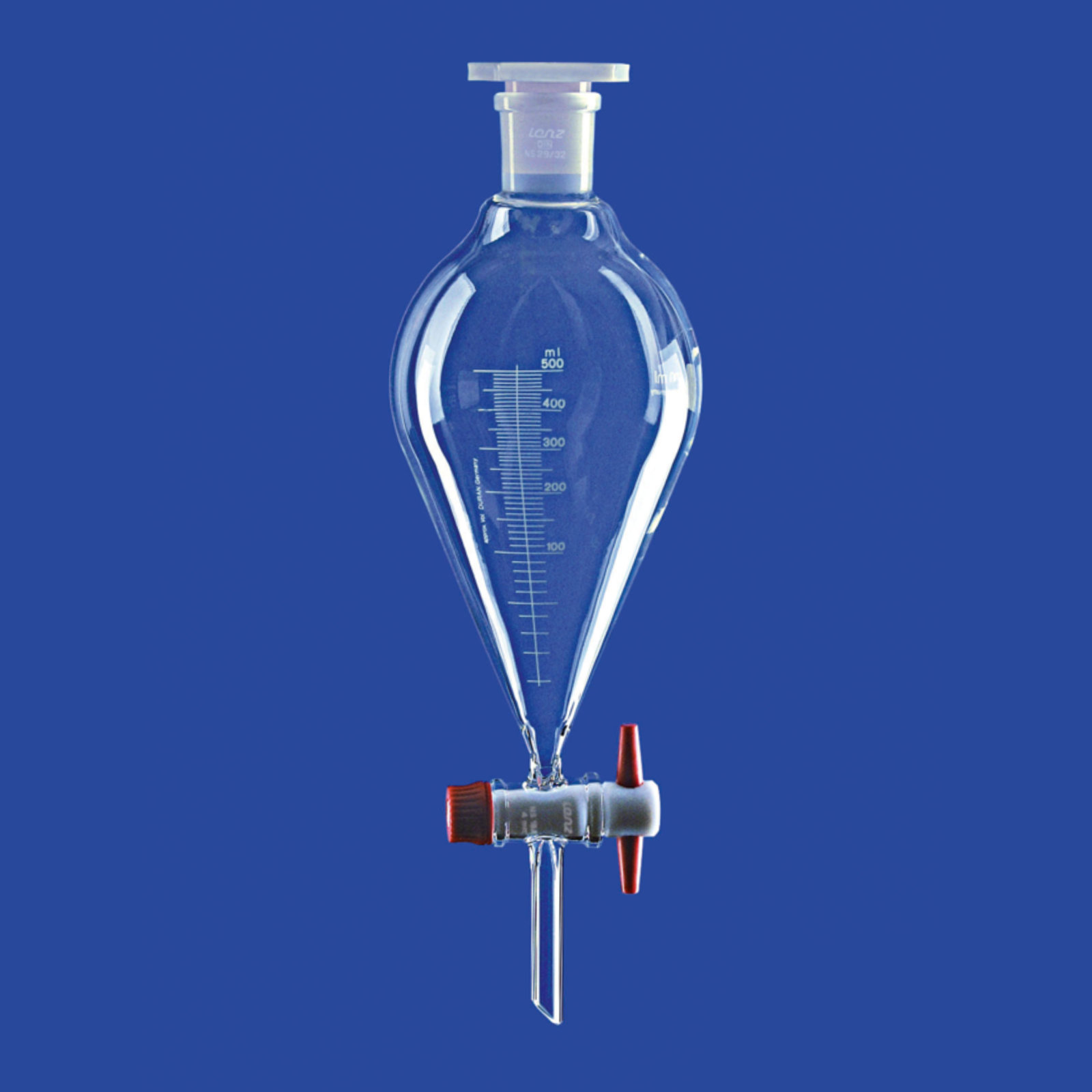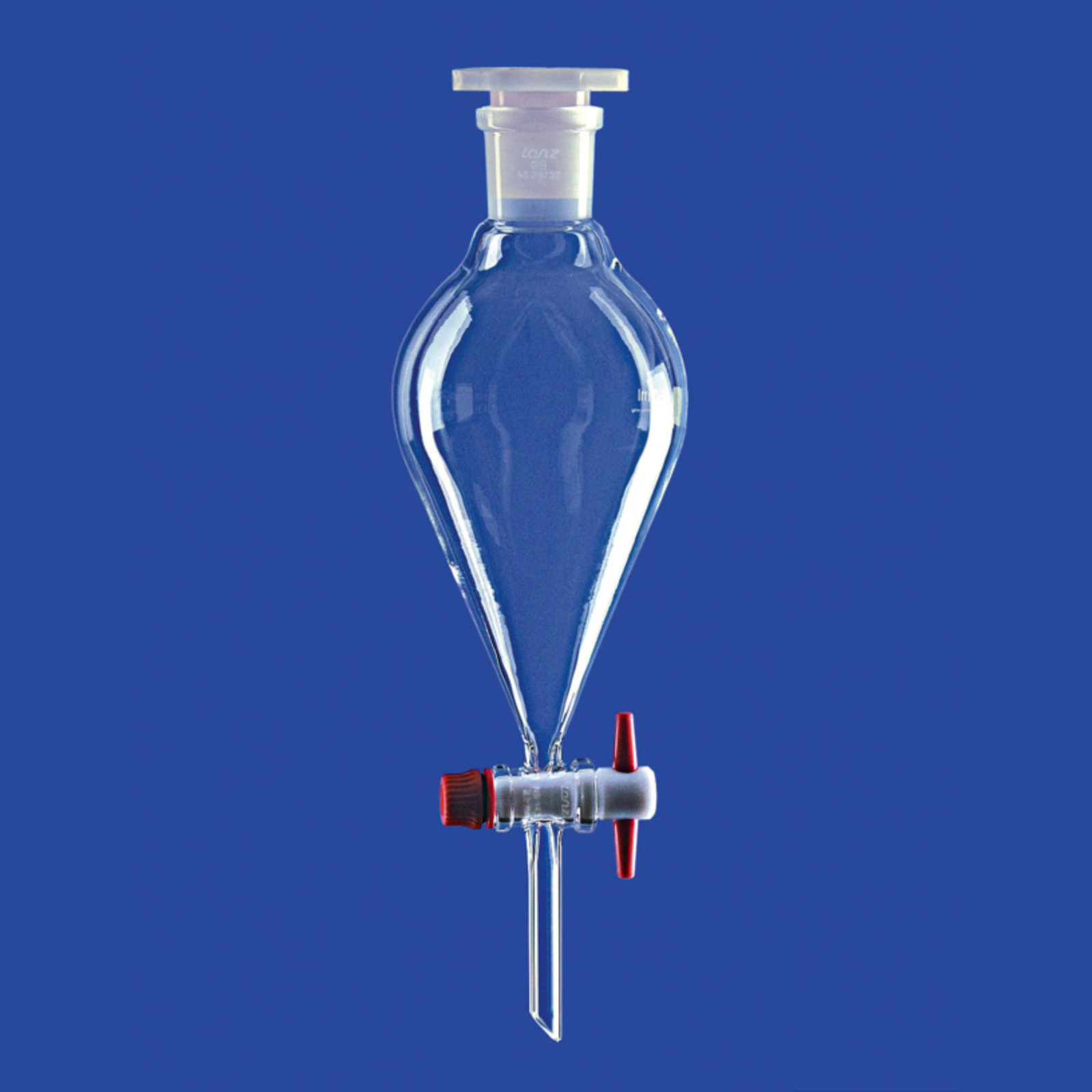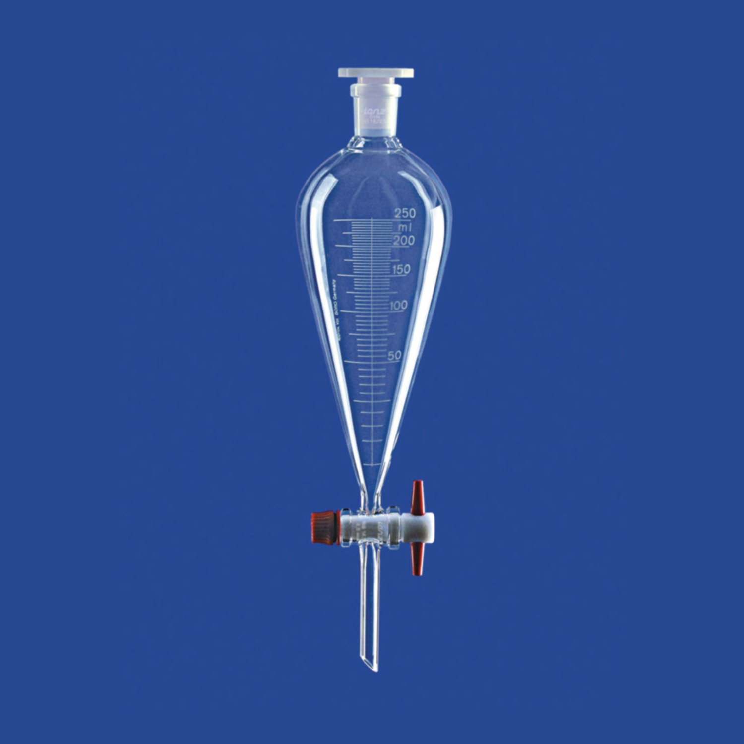 Rozdzielacze gruszkowe wykonane ze szkła borokrzemowego 3.3. Z podziałką. Wyposażone w korek z PE oraz kran szklany lub kran z PTFE.