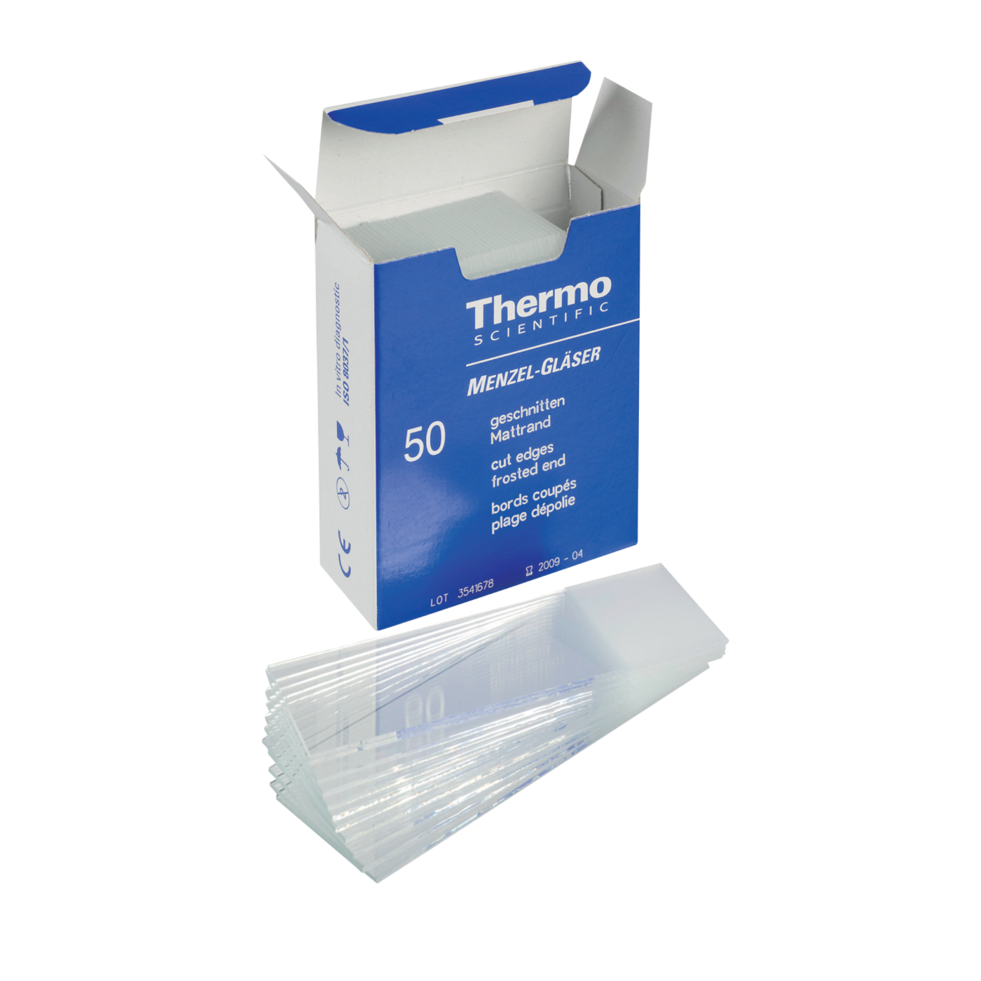 Wysokiej jakości adhezyjne szkiełka mikroskopowe podstawowe firmy Menzel (Thermo Scientific) Z krawędziami szlifowanymi pod kątem 90°. Posiadają białe pole do opisu. Świeże bądź zamrożone fragmenty tkanki lub parafinowe fragmenty tkanki i rozmazy cytologiczne zostają elektrostatycznie i chemicznie związane z powierzchnią szkła.