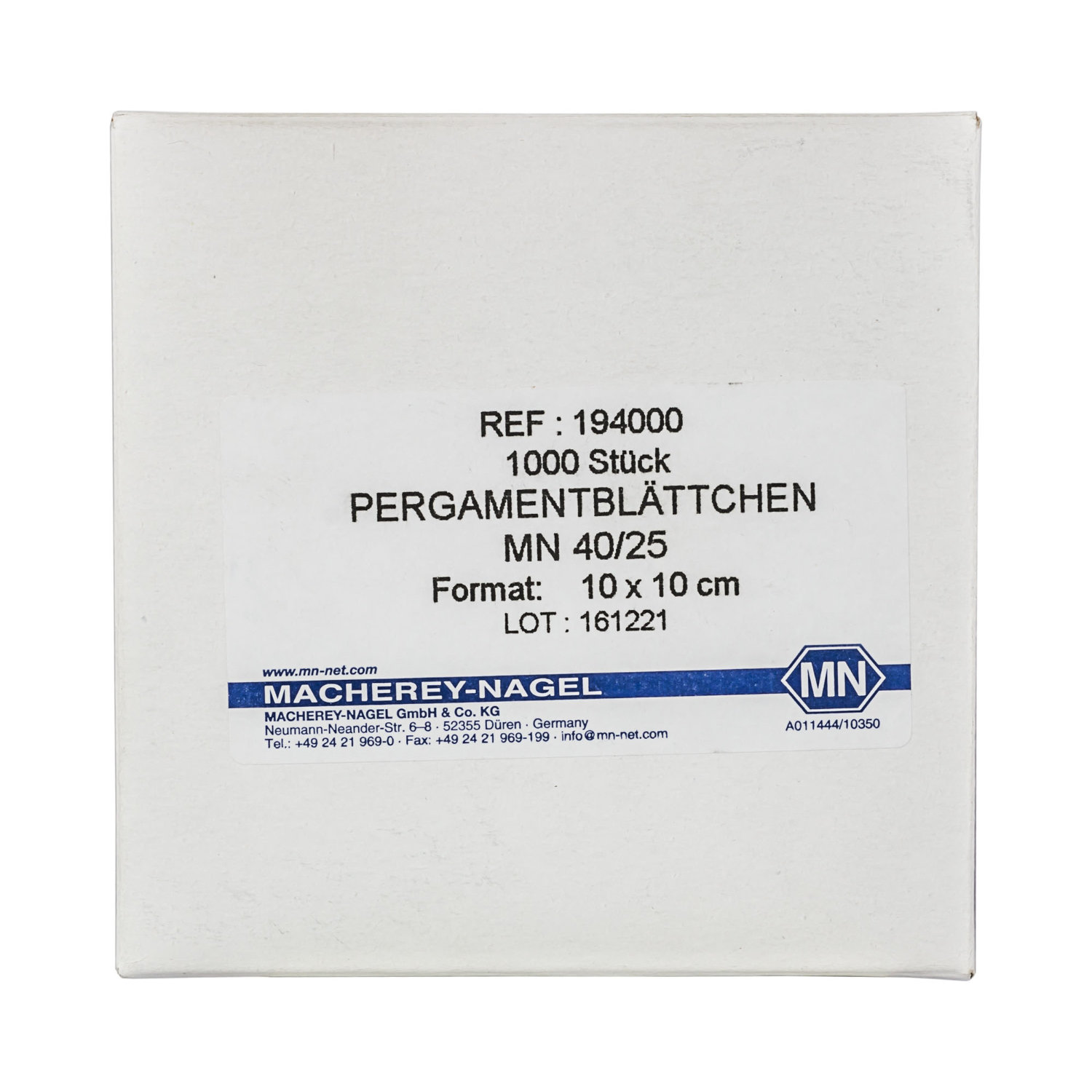 Pergaminowy papier wagowy MN 40/25 stosowany do odważania substancji o konsystencji syropu lub materiałów o strukturze semikrystalicznej. Opakowanie zawiera 1000 arkuszy o wym. 100 x 100 mm.
