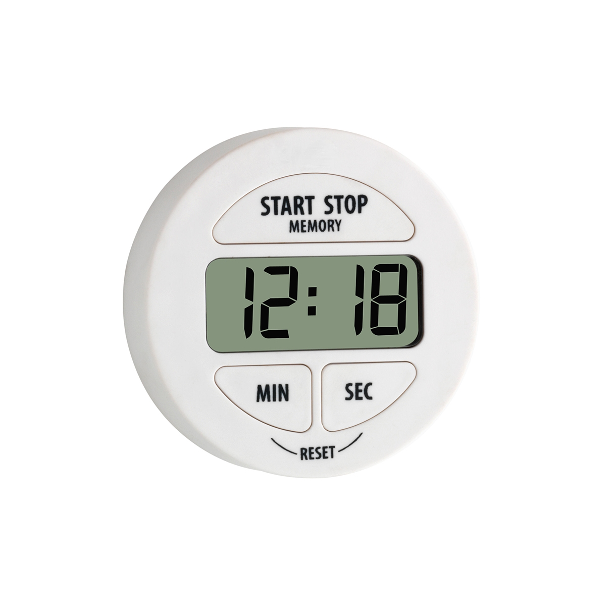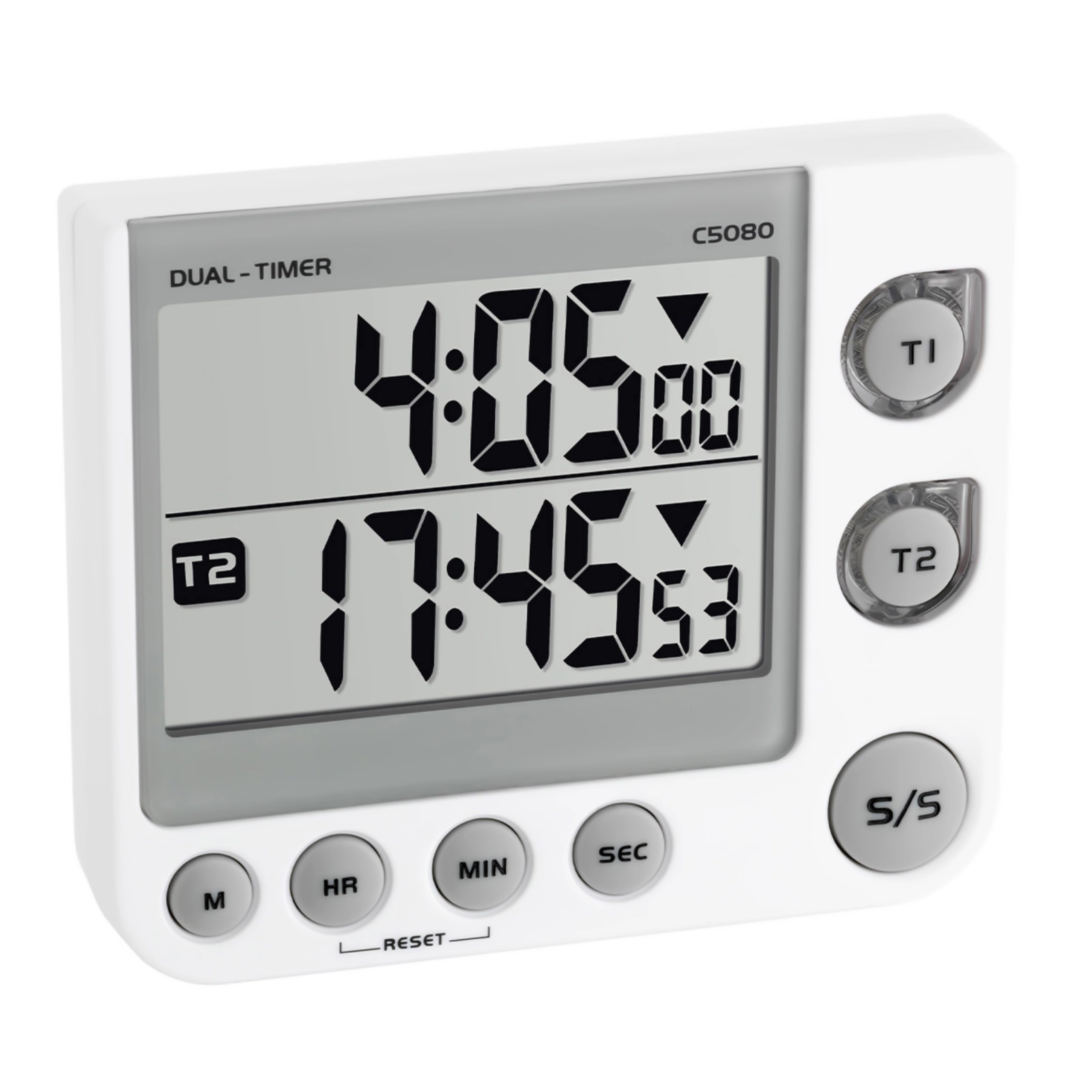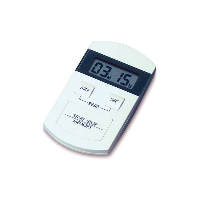 Elektroniczny, 2-kanałowy stoper z funkcją odliczania w dół i w górę, wskazaniem czasu i funkcją pamięci. Czas pracy: 99 godzin, 59 min., 59 sek. w przedziałach sekundowych.