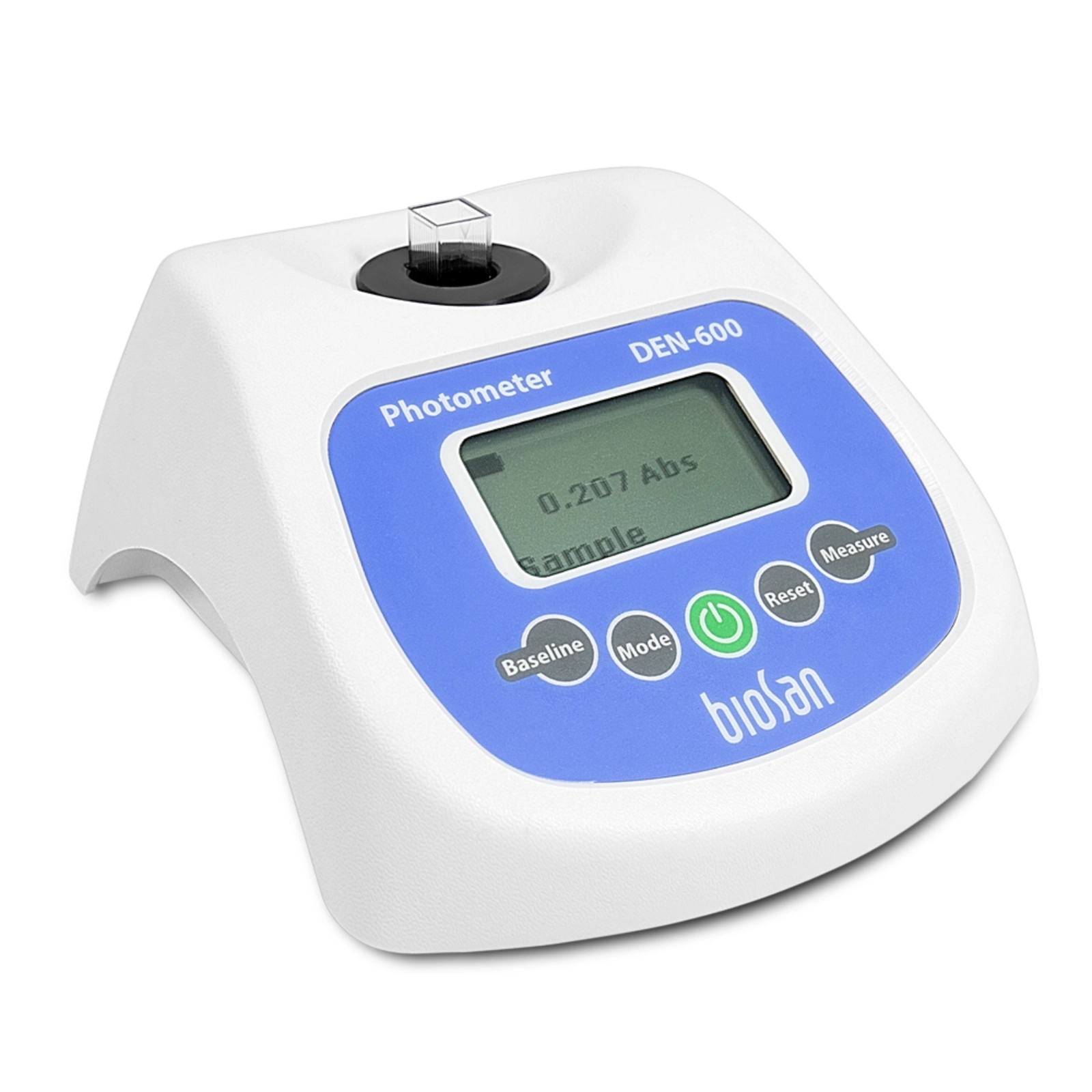 Fotometr DEN-600 firmy Biosan to kompaktowe, bezprzewodowe urządzenie do badania gęstości optycznej. Pomiary przy stałej długości fali – 600 nm. Do metod takich jak: OD600, metoda Bradforda, zmętnienie zawiesiny według skali McFarlanda.