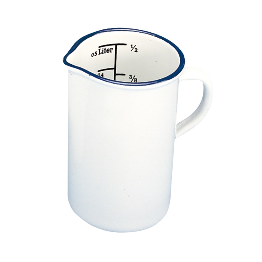Zlewki z blachy stalowej z uchem i wylewem, wewnątrz i na zewnątrz emaliowane na biało. Ze skalą w środku.