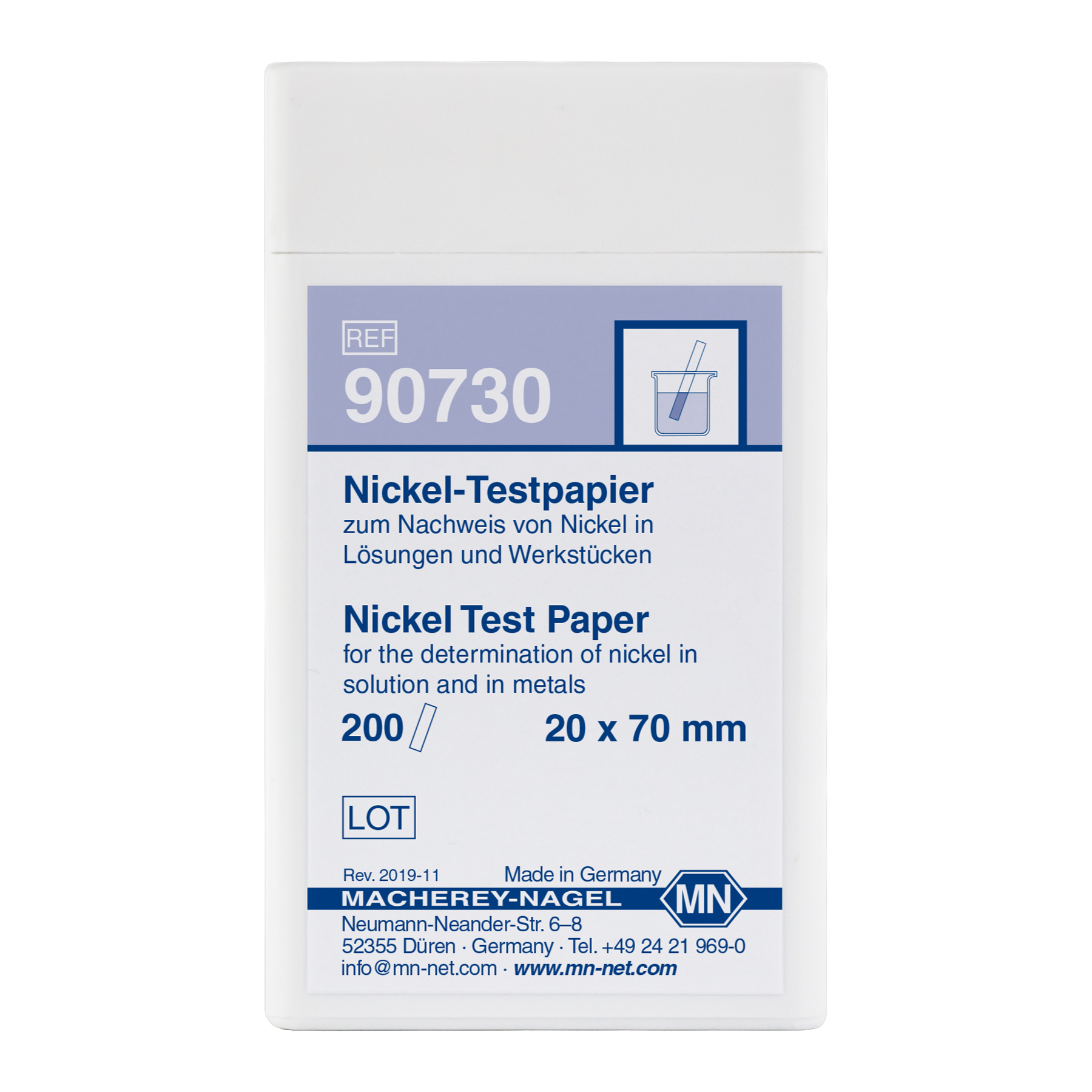 Papierki do oznaczeń jakościowych Nikiel dedykowane są do wykrywania jonów Ni(II) w roztworach lub stopach metali. W obecności tych jonów biały papierek testowy zabarwia się na czerwono. Próg wykrywalności wynosi 10 mg/l Ni2+.