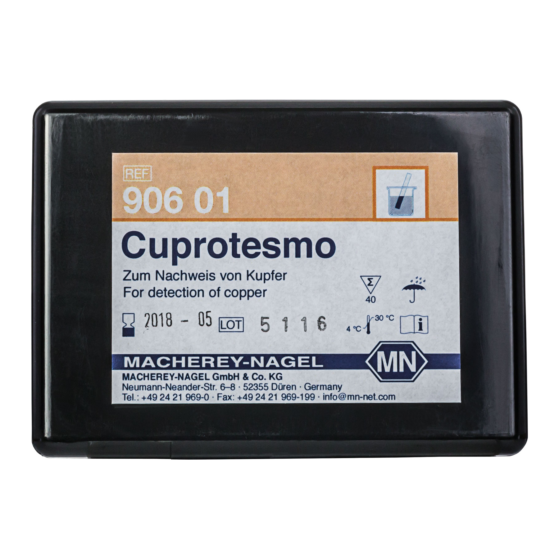 Papierki do oznaczeń jakościowych Cuprotesmo są przeznaczone do wykrywania metalicznej miedzi i jonów miedzi. W obecności miedzi jasnożółty papierek testowy zmienia barwę na różową do purpurowoczerwonej. Próg wykrywalności wynosi 0,05 µg dla miedzi metalicznej lub w postaci soli oraz 3-5 mg/l w przypadku jonów miedzi.
