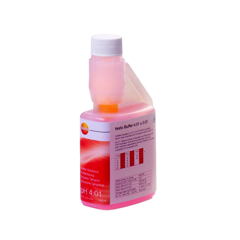Roztwór buforowy Testo o pH 4,01 lub pH 7,00 do kalibracji i regulacji elektrod, pH-metrów. Dostępny w butelce o pojemności 250 ml z dozownikiem.