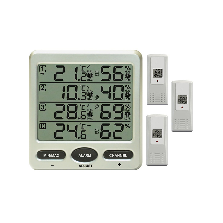 Termohigrometr cyfrowy idealny do stosowania gdy wymagana jest jednoczesna kontrola temperatury i wilgotności w trzech miejscach. Urządzenie wskazuje wartości rejestrowane przez trzy zewnętrzne, bezprzewodowe czujniki oraz przez jednostkę główną. Z możliwością zaprogramowania różnych temperatur oraz wilgotności minimalnych i maksymalnych dla każdego czujnika – po ich przekroczeniu uruchamia się alarm. Posiada duży, czytelny wyświetlacz LCD.