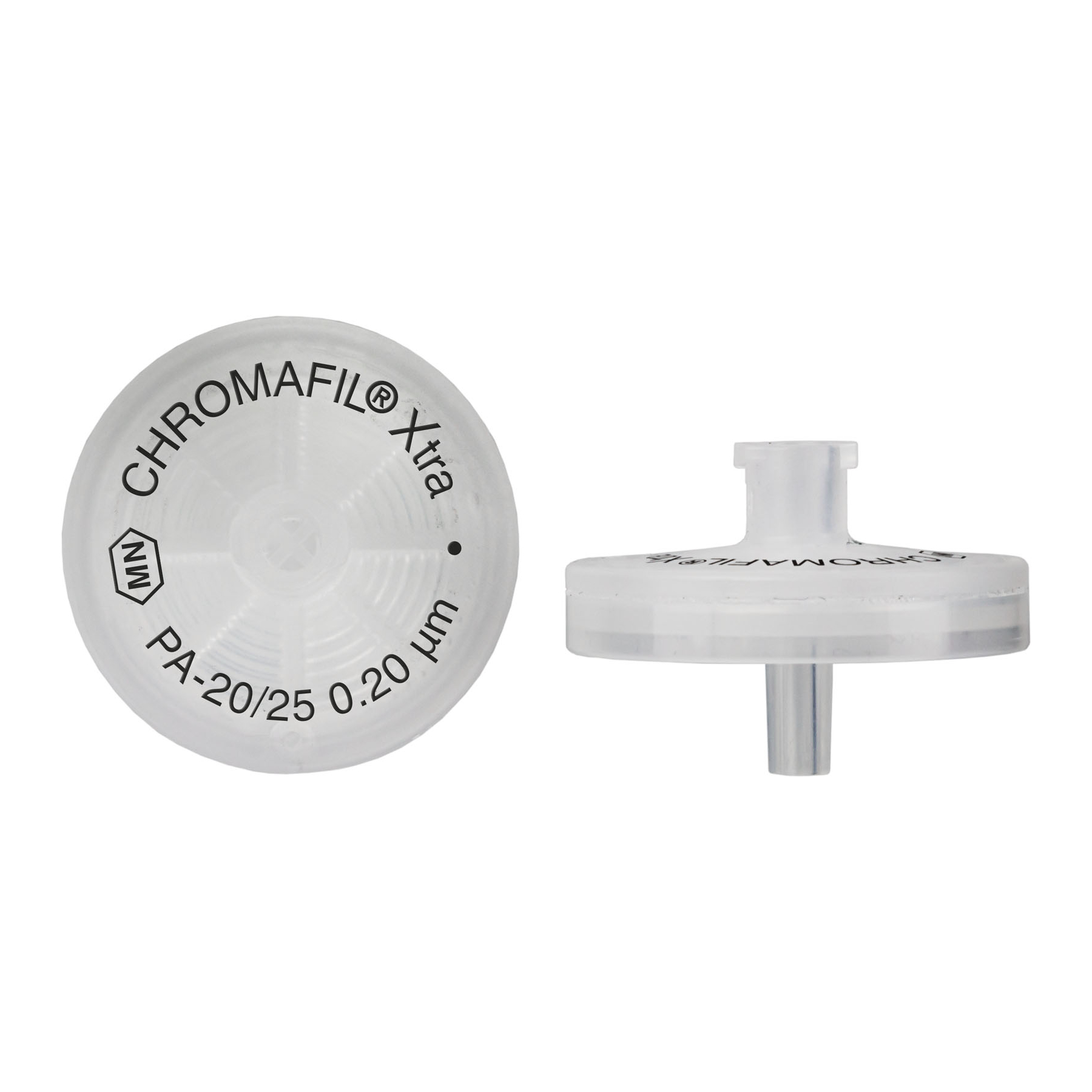 Filtry strzykawkowe Chromafil z membraną z poliamidu (nylonu) o średnicy porów 0,45 lub 0,20 µm. Dedykowane do filtrowania roztworów wodnych i wodno-organicznych o średniej polarności. Doskonale do przygotowania próbek przed metodami chromatograficznymi, takimi jak HLPC (w tym core-shell), UHPLC, GC, czy SFC. Dostępne w wersji niesterylnej w opakowaniach po 100 lub 400 szt. Szczelna obudowa z PP, spawana sonicznie. Autoklawowalne w 121°C.
