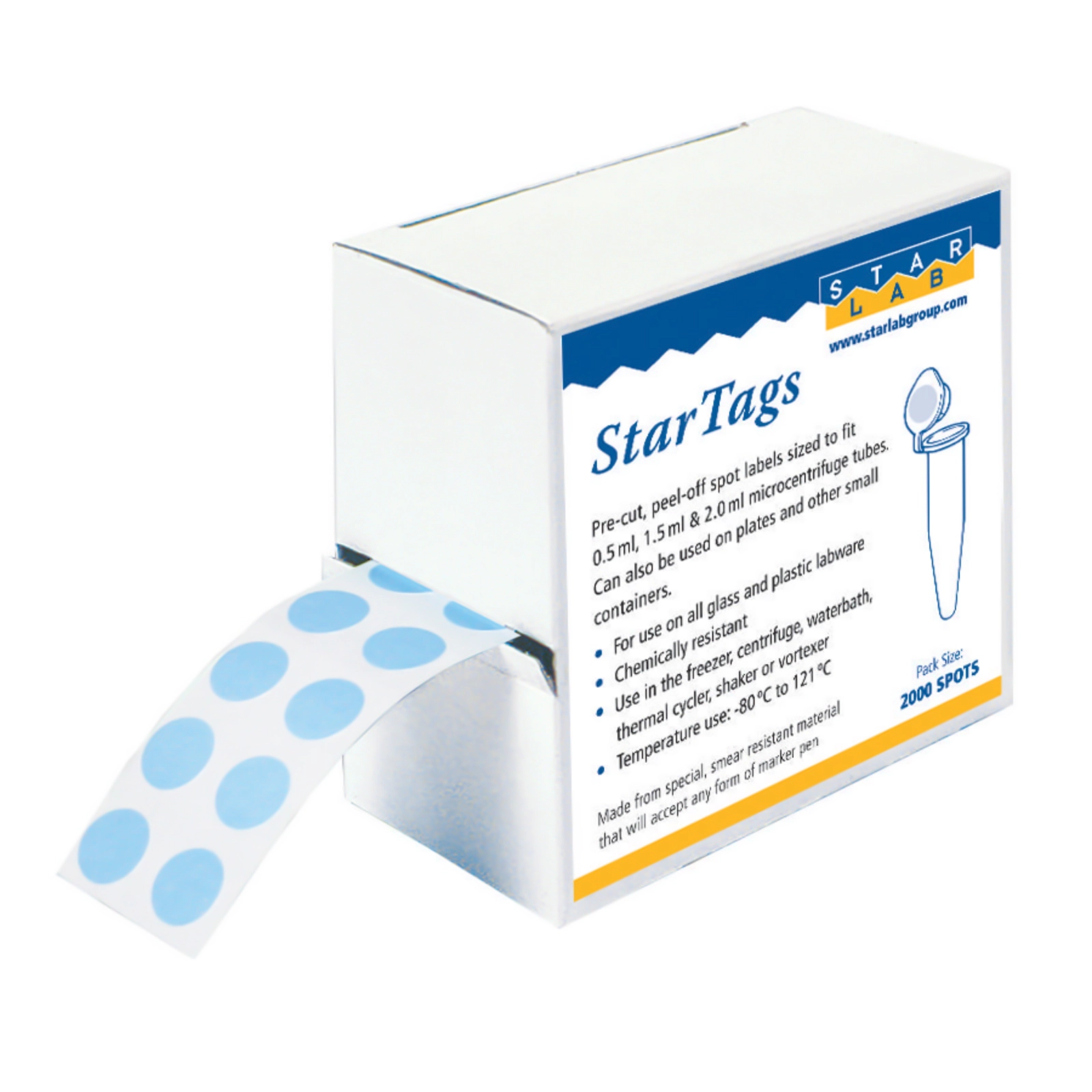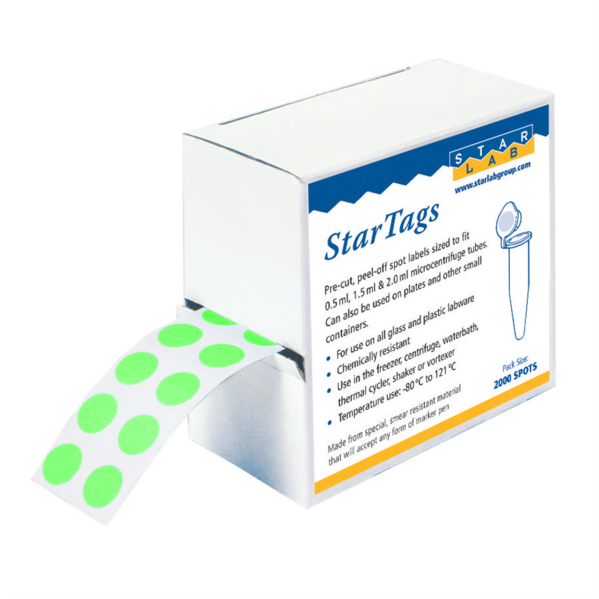 Naklejki StarTags™ na rolce. Kształt okrągły, średnica 9 mm. Nadają się do znakowania różnych materiałów używanych w laboratorium. Wytrzymałe w trudnych warunkach: odporne na zamrażanie, kąpiele wodne i wirowanie. Przyczepność nawet w temperaturach bliskich wrzenia i do -85°C. Autoklawowalne.