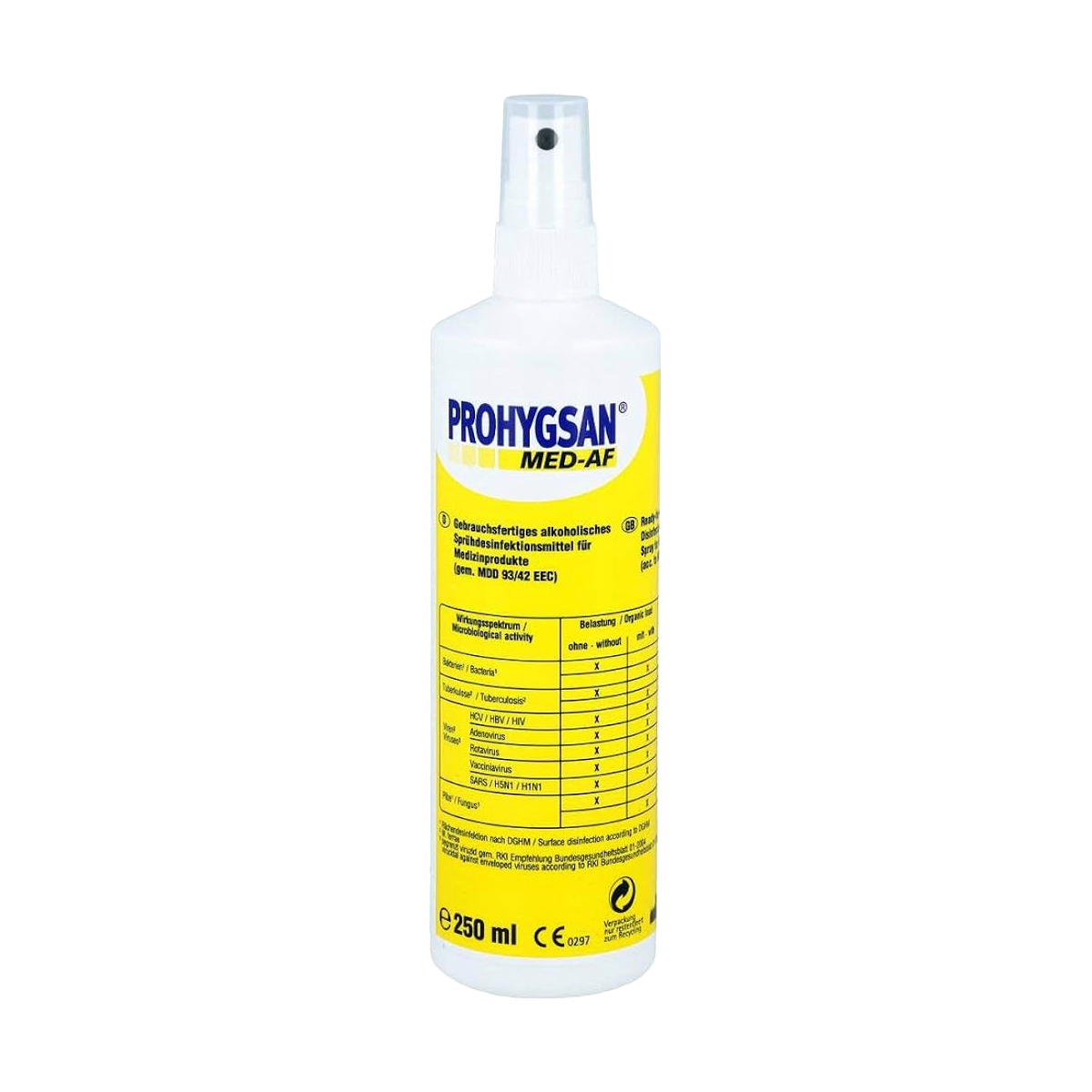 Chusteczki Prohygsan med-AF nasączone środkiem dezynfekująco-czyszczącym na bazie alkoholu. Działanie dezynfekujące następuje po 30 sekundach (bez obciążenia) lub po 1 minucie (z obciążeniem). Skuteczne w zwalczaniu: bakterii, prątków gruźlicy, grzybów, wirusów HCV, HBV, HIV, adenowirusa, rotawirusa, vaccinawirusa, wirusa SARS i grzybów.