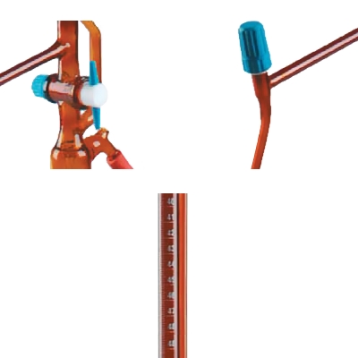 Napisy i wartości nominalne są drukowane trwałą emalią w kolorze białym. Bursztynowe zabarwienie szkła chroni wrażliwą zawartość biurety przed działaniem światła widzialnego, ultrafioletu i promieniowania podczerwonego. Biurety automatyczne dostarczane są bez butelki i gruszki, które należy zamawiać osobno.