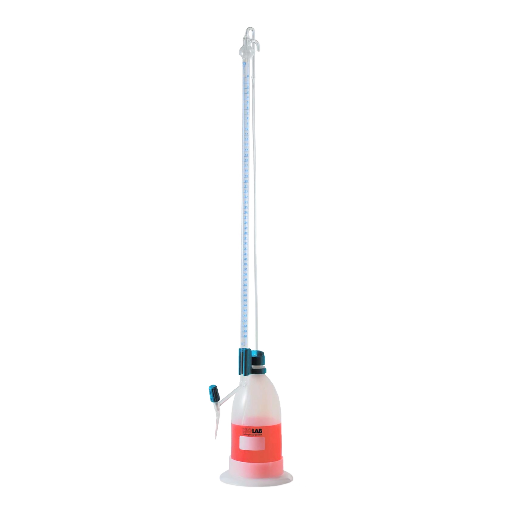 Biurety automatyczne, wzór Schillinga, wykonane ze szkła borokrzemowe 3.3. Zgodnie z normą DIN/ISO skalibrowane pod próżnią jako klasa AS. W skład zestawu wchodzi: rurka szklana biurety z system automatycznego zerowania, zawór iglicowy z PTFE, butla na odczynnik z polietylenu (PE) oraz wężyk do napełniania biurety. Dodatkowo jest zamontowany ściśle przylegający statyw na butlę zapewniający zwiększoną stabilność biurecie.