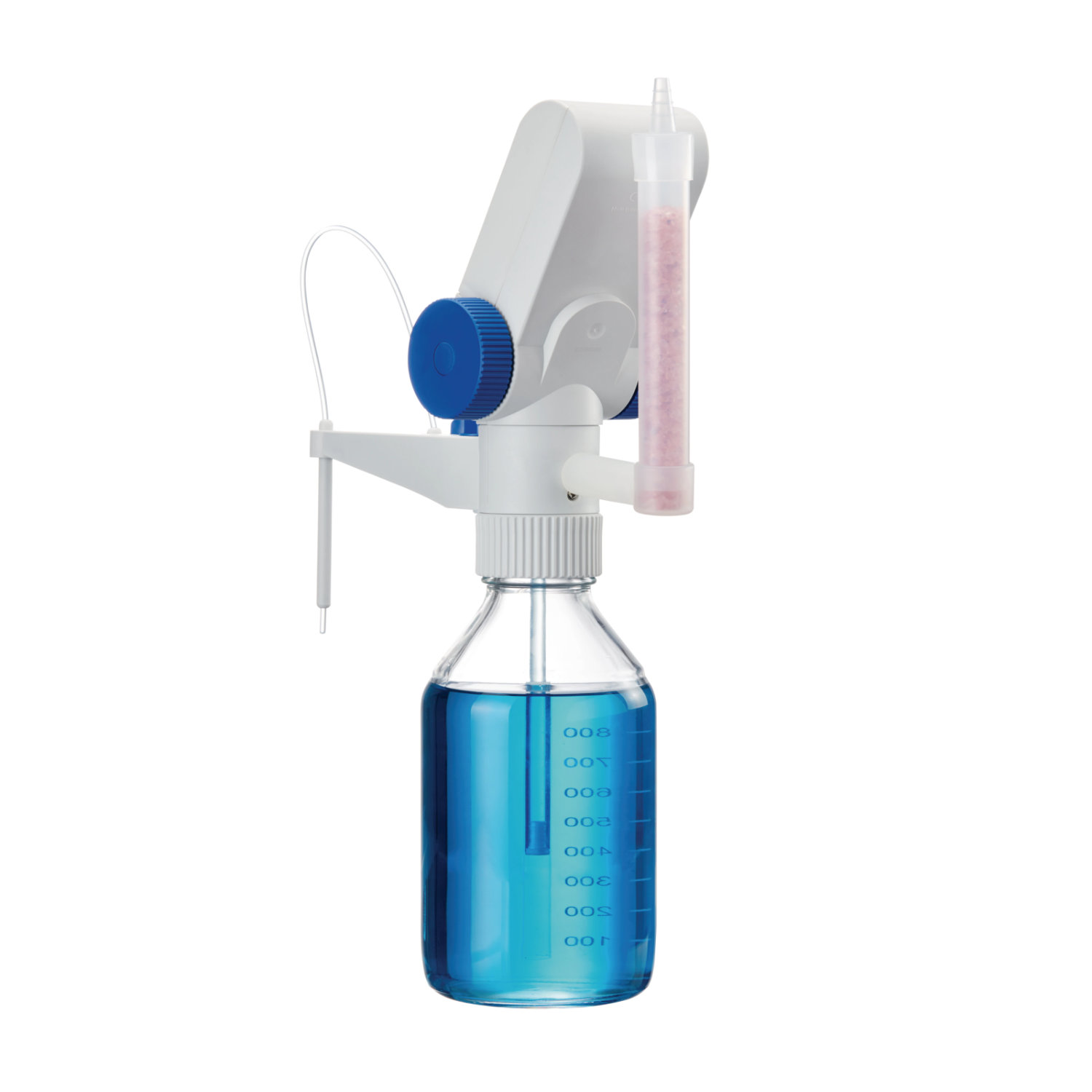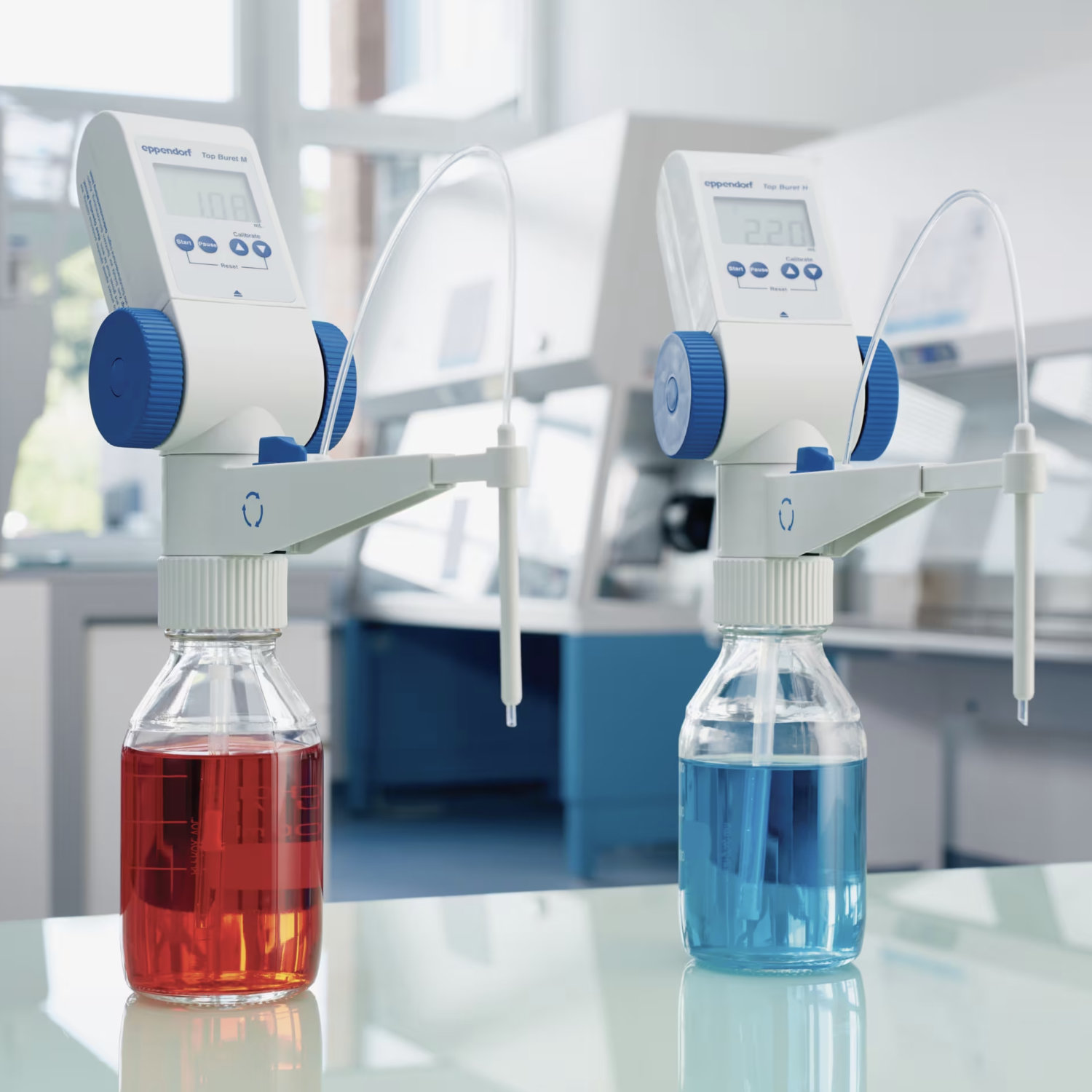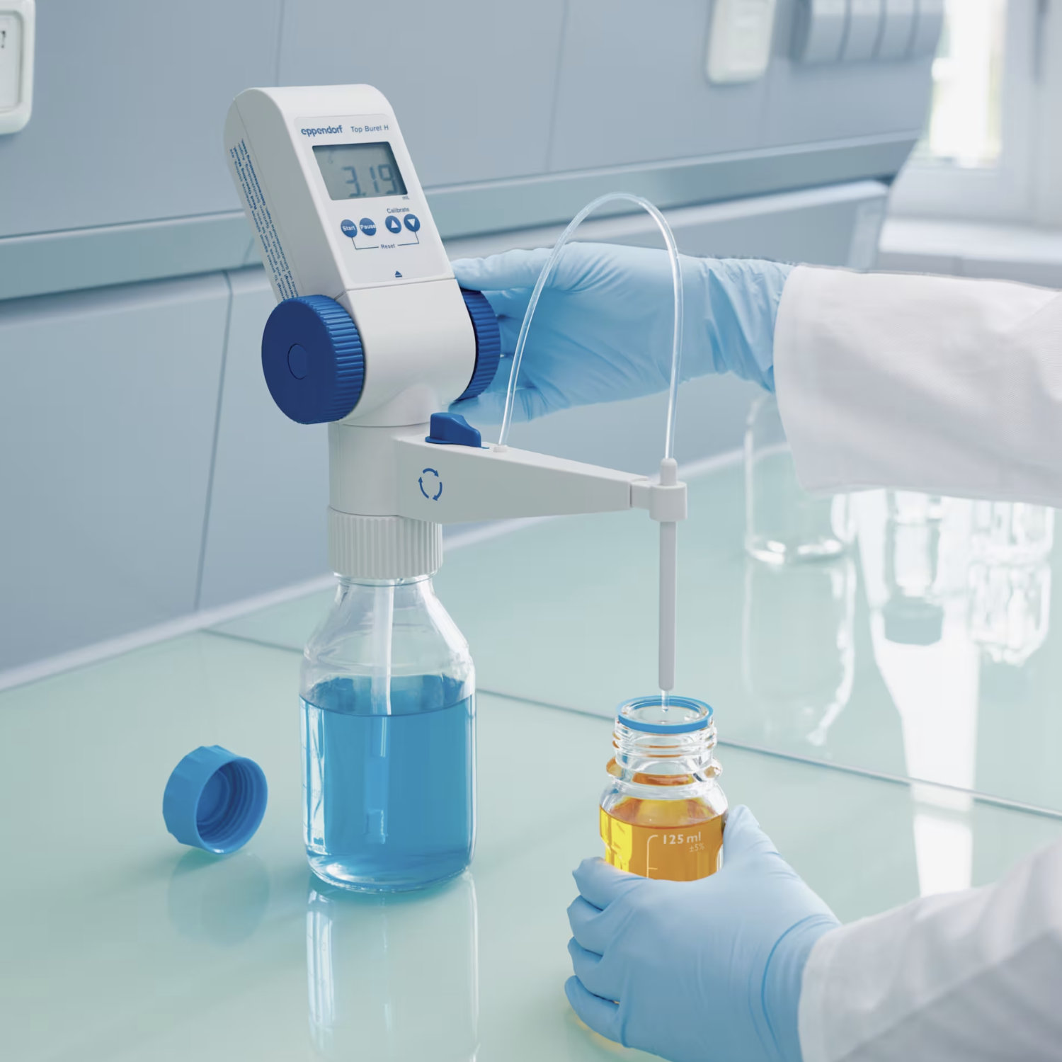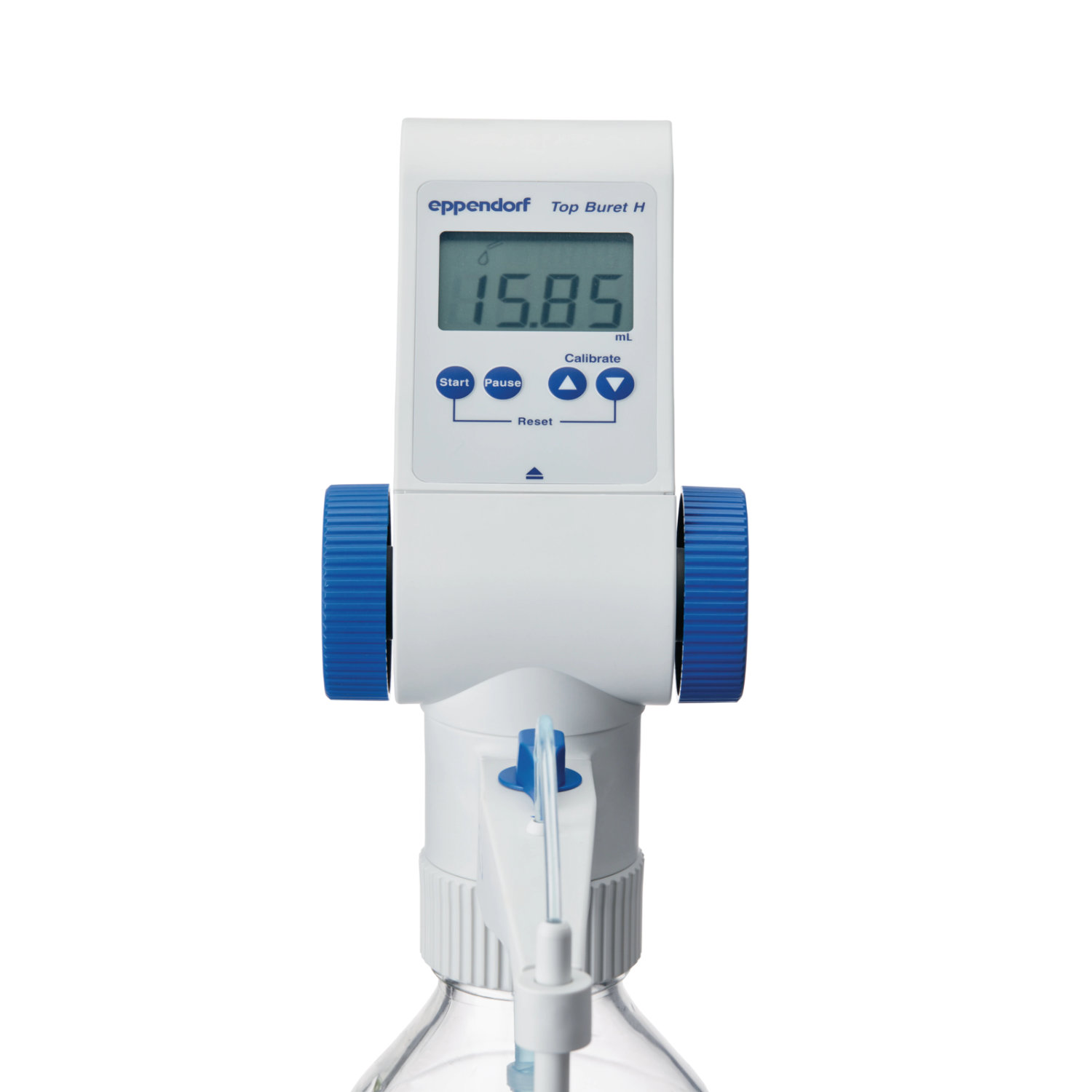 Biureta Eppendorf Top Buret pozwala na miareczkowanie manualne w sposób ciągły i bezimpulsowy. Obsługa urządzenia jest łatwa i intuicyjna. Duży czytelny wyświetlacz, z zakresem od 10 µl do 999,9 ml i proste pokrętło pozwalają na szybkie ustawienie żądanej objętości cieczy. Dozowanie odbywa się w sposób precyzyjny i jednostajny.