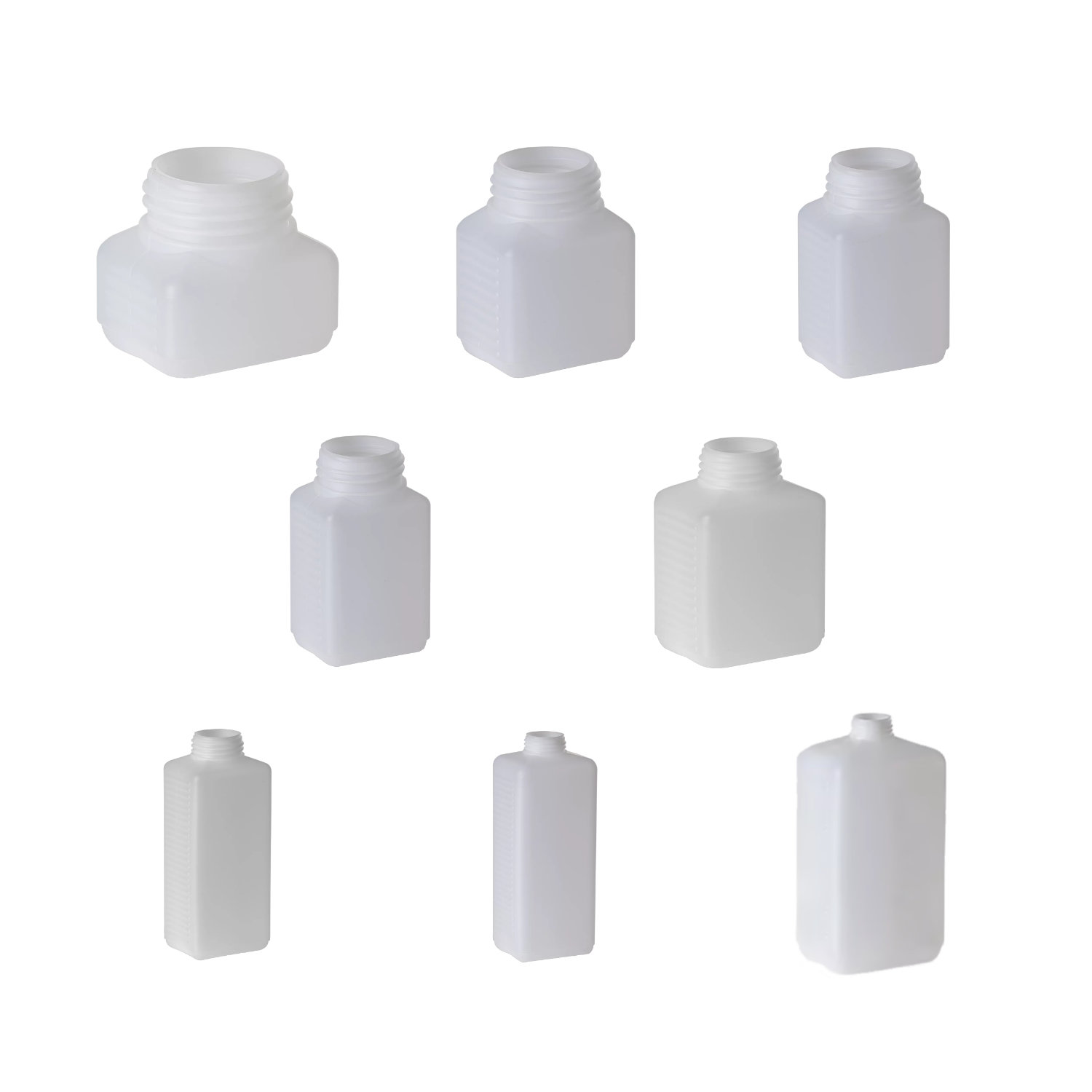 Butelki czworokątne wykonane z HDPE. Posiadają gwint o śr. 40 mm (standard RD40). Nadają się do przechowywania materiałów sypkich. Każda butelka posiada żebrowanie ułatwiające chwytanie. Prostokątny kształt pozwala w ergonomiczny sposób wykorzystać dostępną powierzchnię.