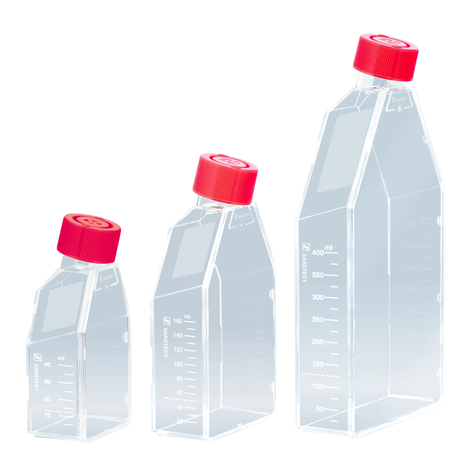 Butelki do hodowli adherentnej Sarstedt z czerwoną zakrętką. Wykonane z wysokiej jakości przejrzystego polistyrenu (PS), który przetworzono do płaskiej powierzchni wzrostu nadającej się idealnie do obserwacji mikroskopowych. Hydrofilowa standardowa powierzchnia wzrostu zapewnia optymalne podłoże hodowlane dla komórek adherentnych. Wszystkie butelki do hodowli tkankowych Sarstedt są testowane i certyfikowane zgodnie ze znakiem jakości TC Tested, który gwarantuje że produkt jest sterylny, nie zawiera pirogenów ani endotoksyn, jest niecytotoksyczny, bez DNA i bez zawartości DNazy/RNazy. Każda butelka jest oznaczona numerem serii i datą ważności.