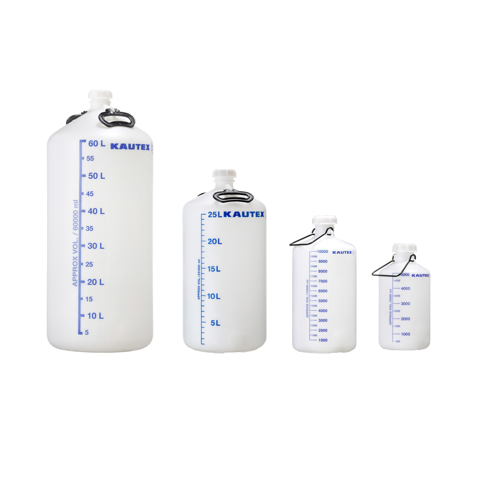 Butle wykonane z HDPE, z nakrętką i drucianym uchwytem ułatwiającym przenoszenie (poj. 5 l i 10 l) lub z dwoma uchwytami z tworzywa sztucznego (poj. 25 l i 50 l) . Posiadają podziałkę. Modele w wersji bez otworu na kran.